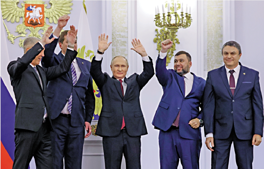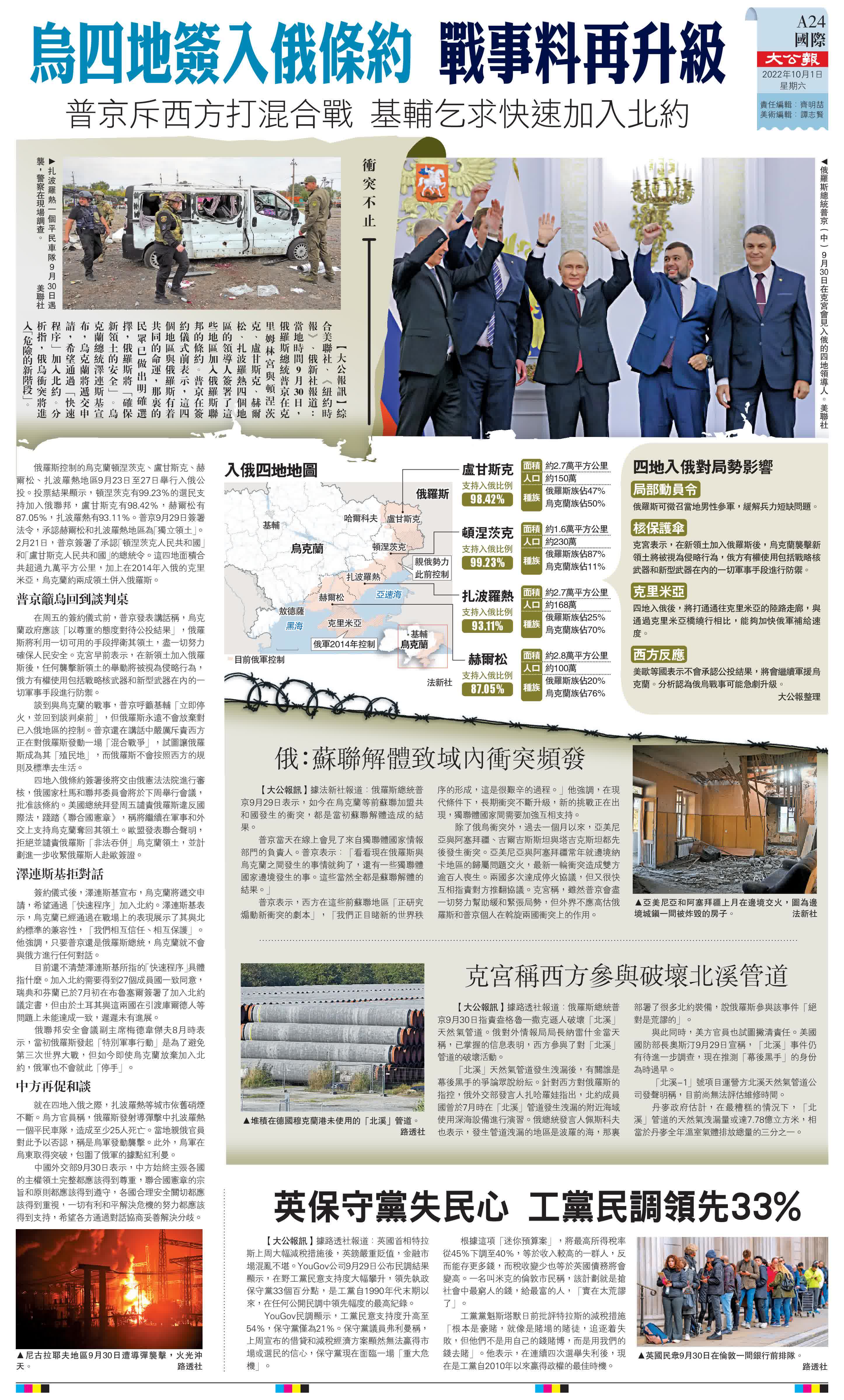 大公報綜合美聯社、《紐約時報》、俄新社、法新社、路透社報道:當地時間9月30日,俄羅斯總統普京在克里姆林宮與頓涅茨克、盧甘斯克、赫爾松、扎波羅熱四個地區的領導人簽署了這些地區加入俄羅斯聯邦的條約。普京在簽約儀式前表示,這四個地區與俄羅斯有着共同的命運,那裏的民眾已做出明確選擇,俄羅斯將「確保新領土的安全」。烏克蘭總統澤連斯基宣布,烏克蘭將遞交申請,希望通過「快速程序」加入北約。分析指,俄烏衝突將進入「危險的新階段」。