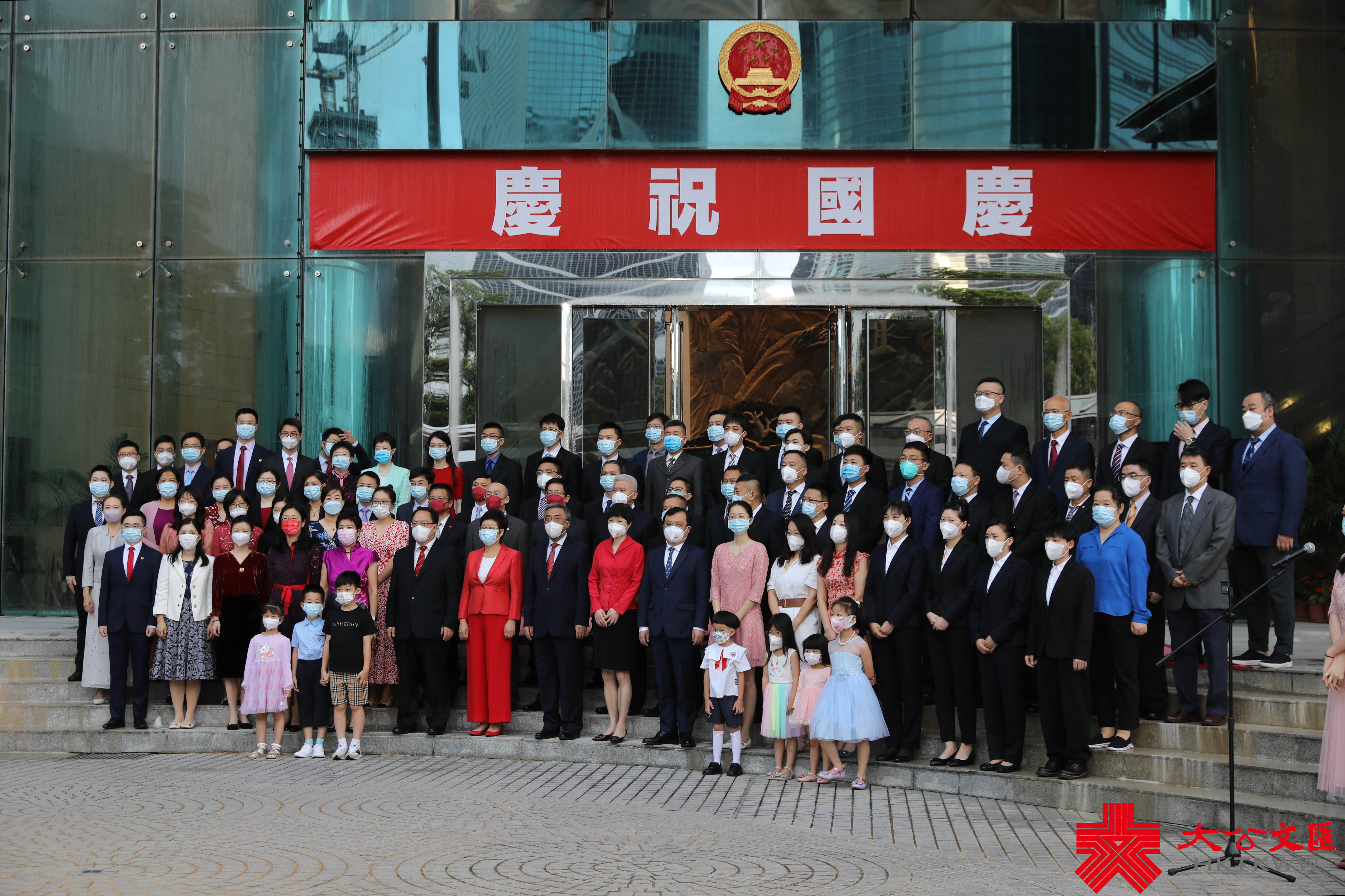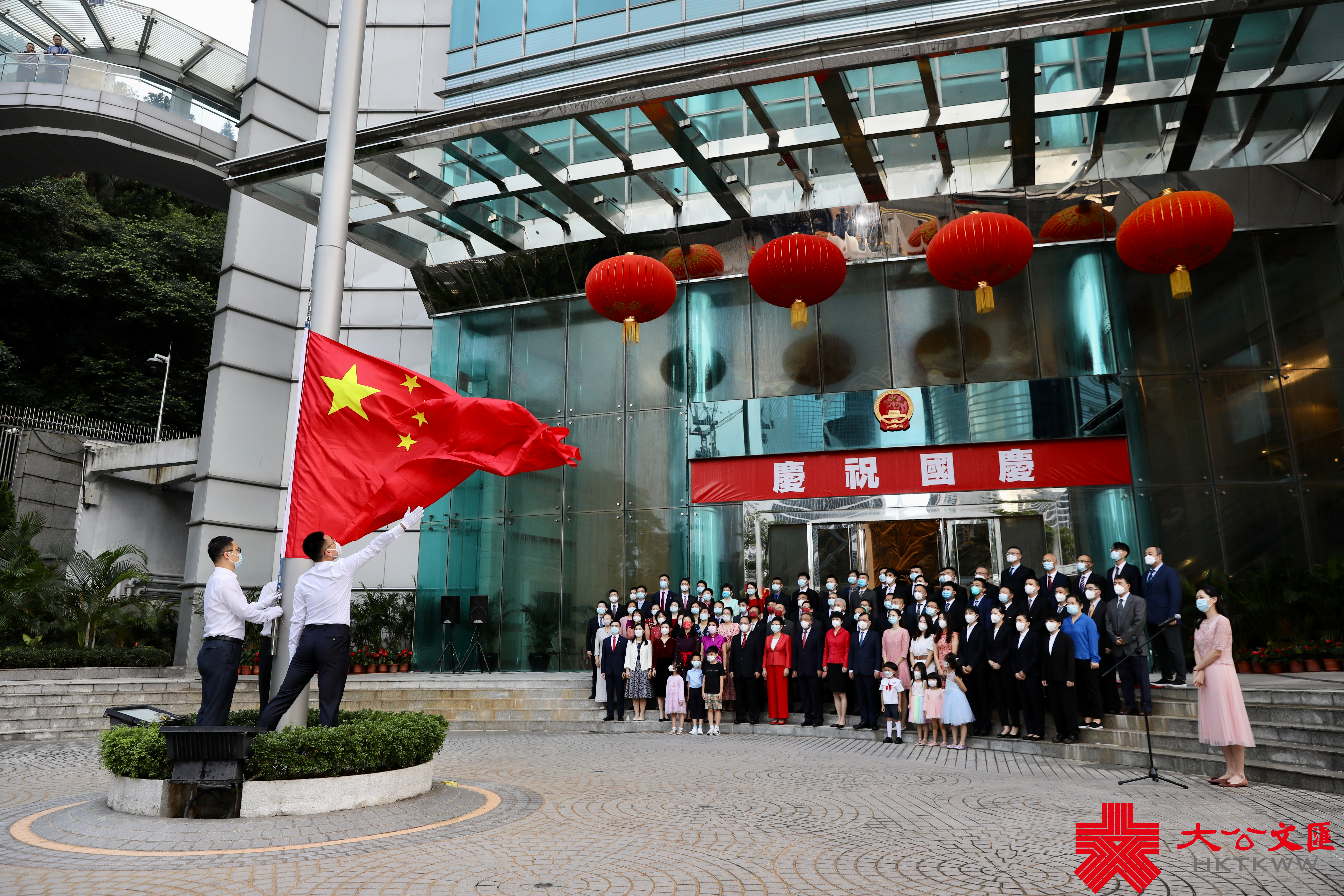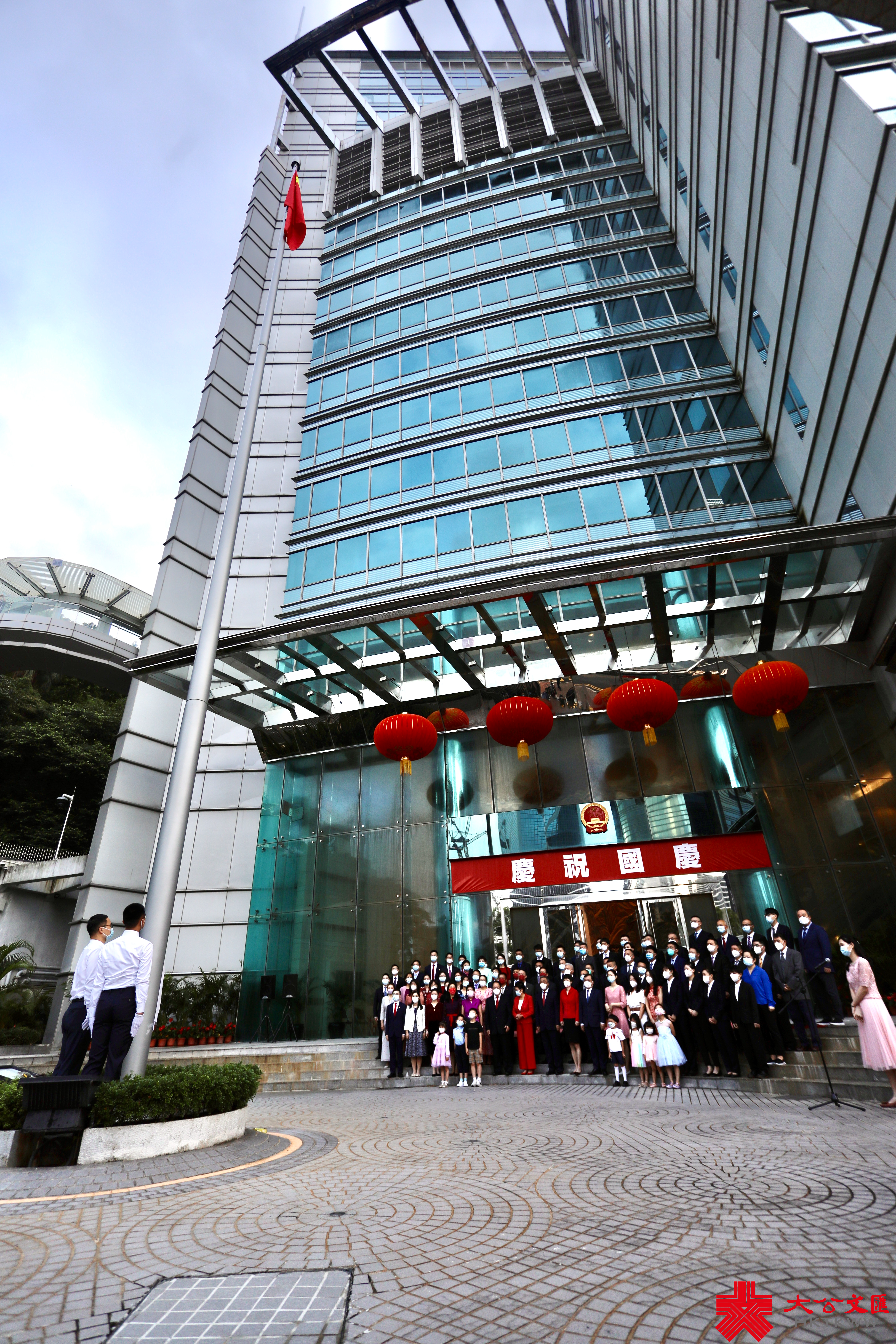 大公文匯全媒體報道,為慶祝中華人民共和國成立73周年,外交部駐港特派員公署今日(10月1日)隆重舉行國慶升旗儀式。上午7時整,升旗儀式正式開始。鮮艷的五星紅旗在莊嚴的國歌聲中冉冉升起。