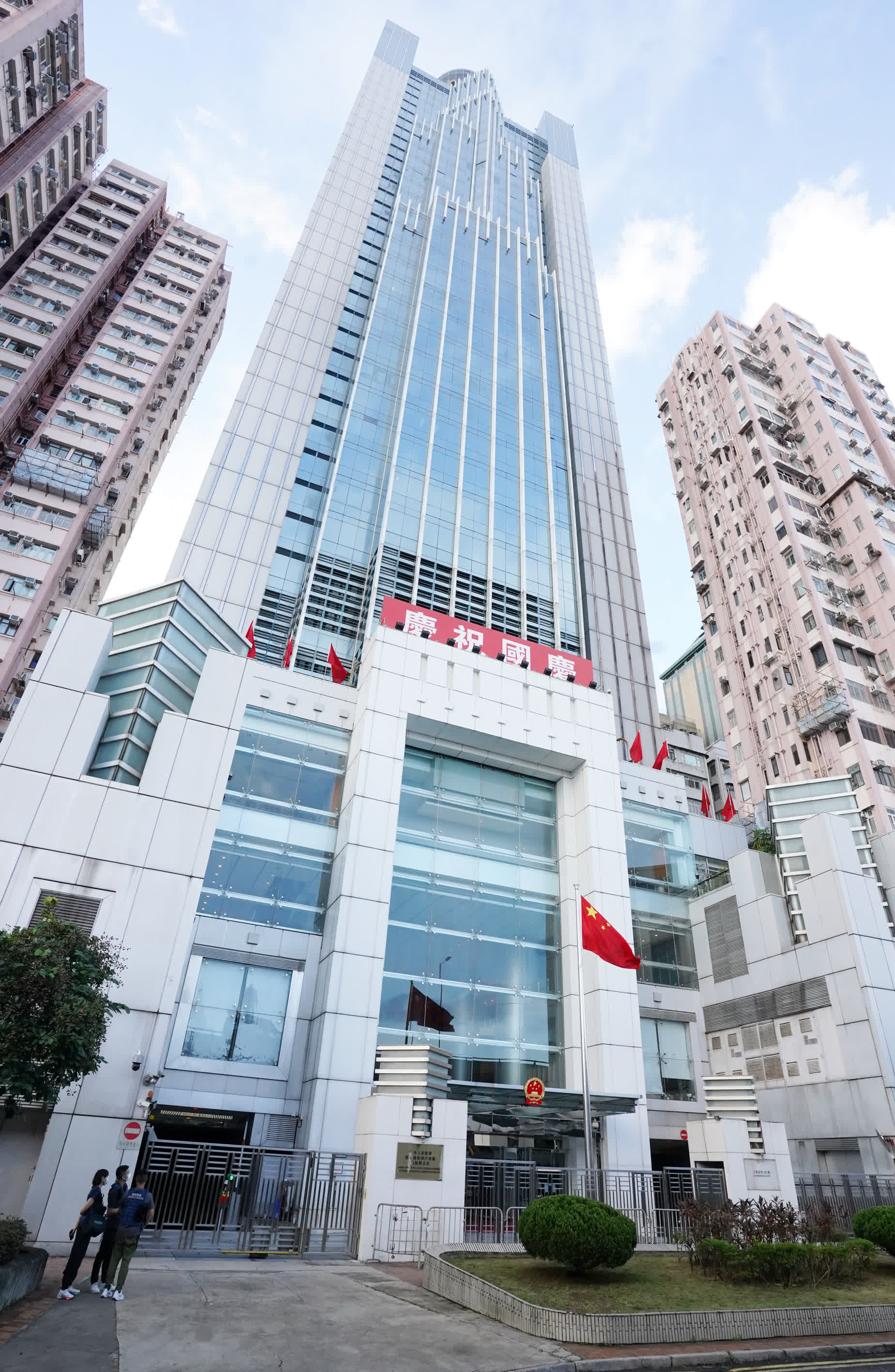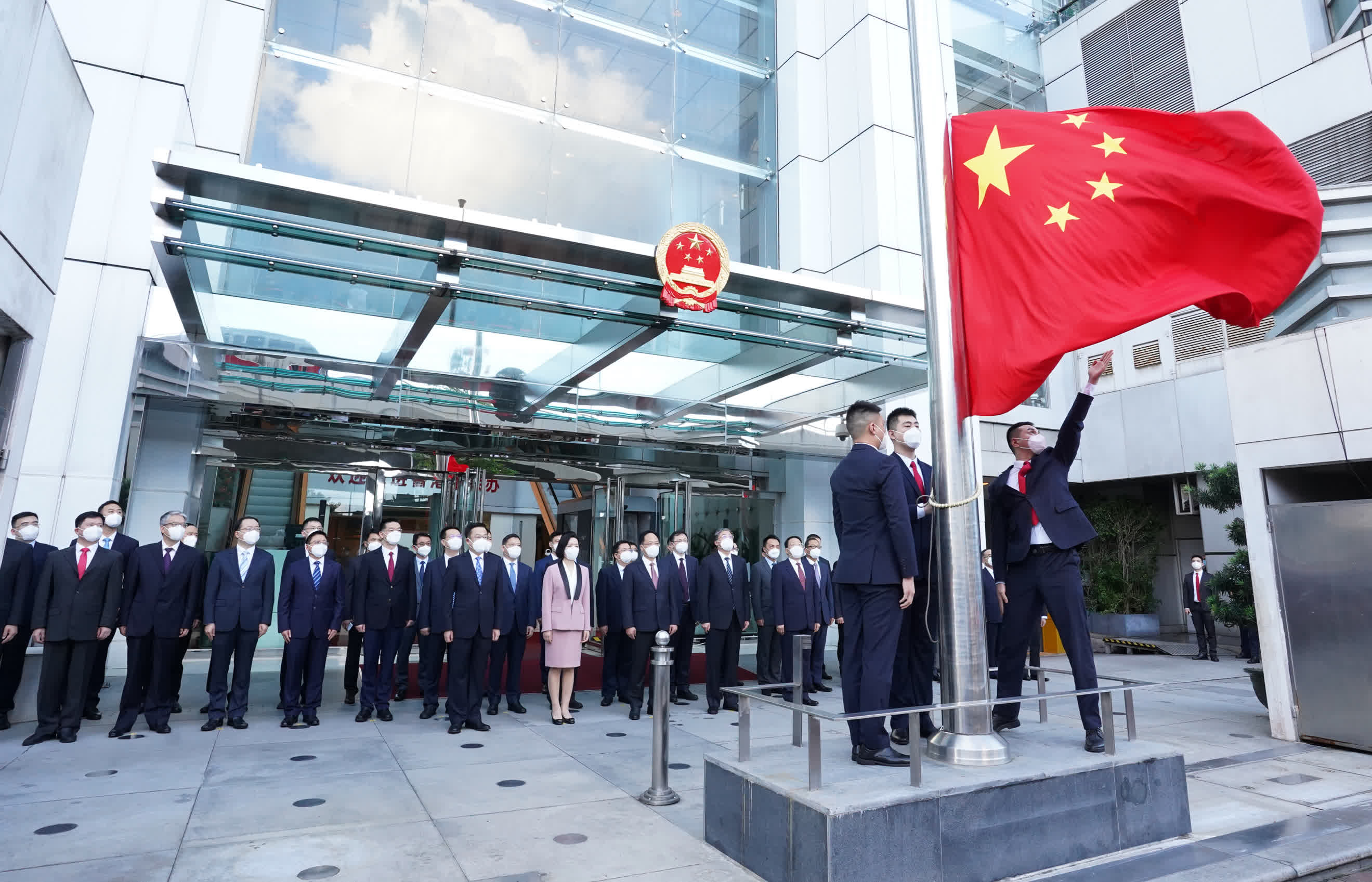 7時整,升國旗儀式開始。香港中聯辦副主任陳冬、盧新寧、羅永綱、何靖、尹宗華,以及幹部員工代表在辦公樓前莊嚴肅立。升旗手護送國旗進場,步伐鏗鏘。伴隨着雄壯的國歌聲,鮮艷的五星紅旗冉冉升起。全體人員行註目禮向國旗致敬,齊聲高唱國歌,祝福偉大祖國繁榮富強、國泰民安。