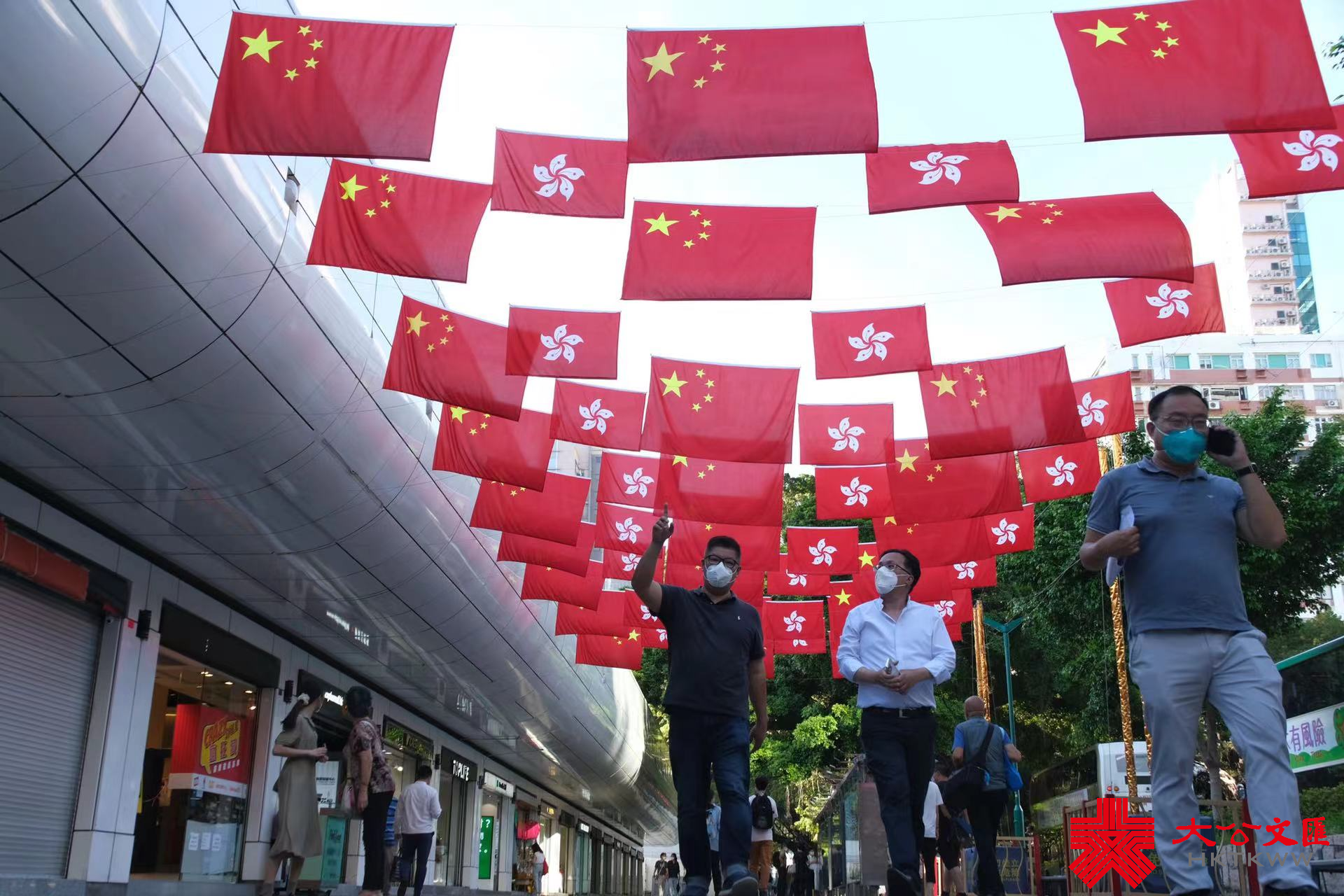 大公文匯全媒體報道,今天(10月1日)是國慶日,香港各區到處都能看到懸掛着的國旗、區旗隨風飄揚,交相輝映,在陽光下顯得格外好看。