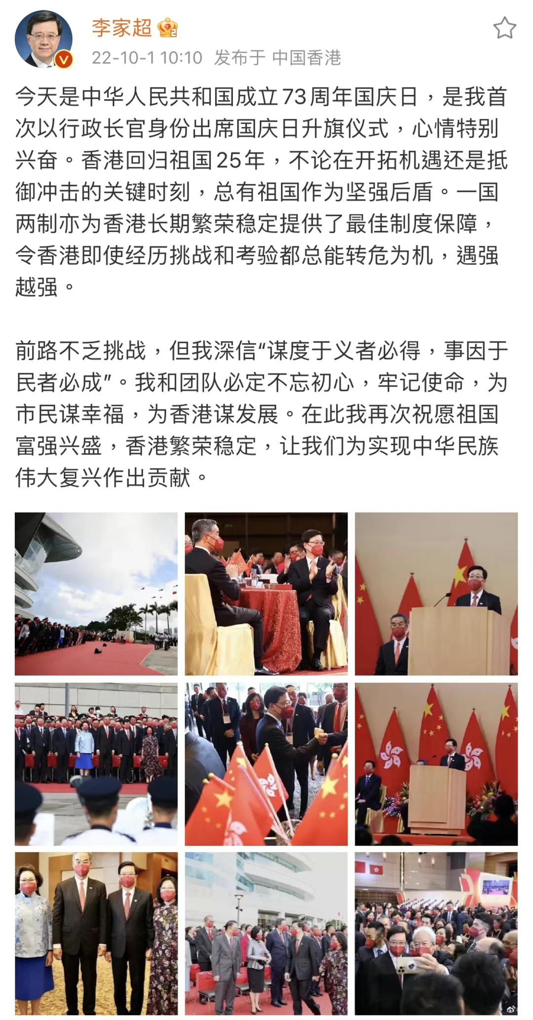 大公文匯全媒體報道,今日(10月1日)是國慶日,特首李家超第一次以行政長官身份出席國慶日升旗儀式。之後,他在微博及Facebook平台上發文表示,「今天是中華人民共和國成立73周年國慶日,是我首次以行政長官身份出席國慶日升旗儀式,心情特別興奮。香港回歸祖國25年,不論在開拓機遇還是抵禦衝擊的關鍵時刻,總有祖國作為堅強後盾。」