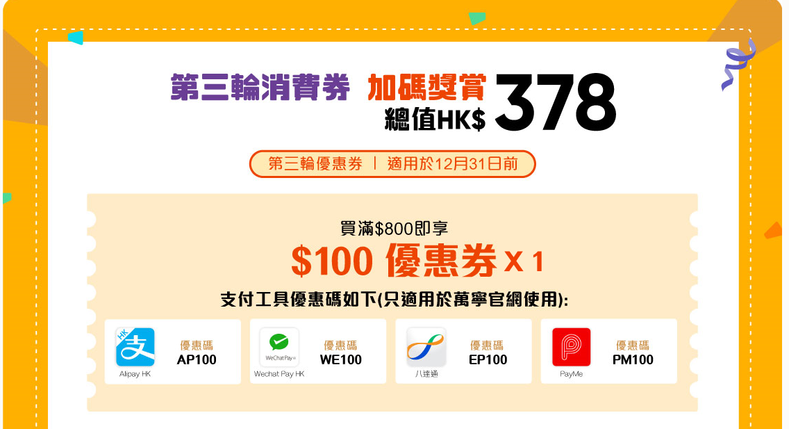 於網店使用八達通、AlipayHK、WeChat Pay HK或PayMe購物滿800元,亦可即時扣減100元。優惠期由10月1日至12月31日。