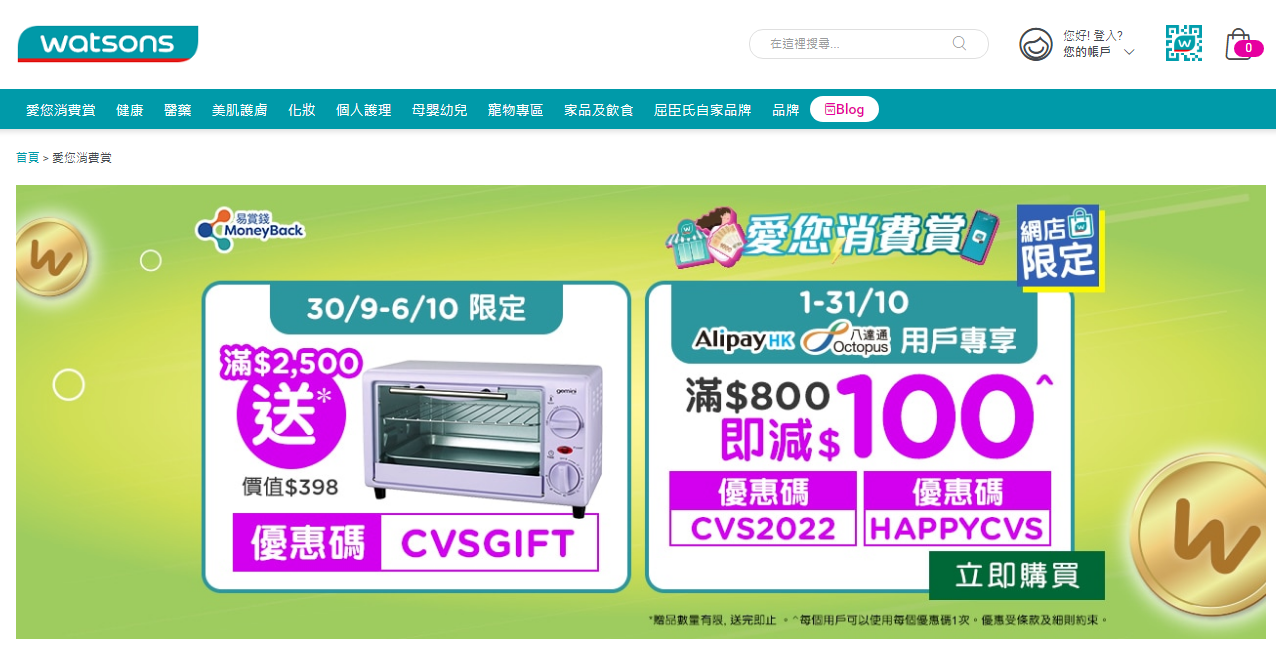 由10月1日起至31日,於屈臣氏門市使用八達通、AlipayHK、BoC Pay購物滿250元即減25元。