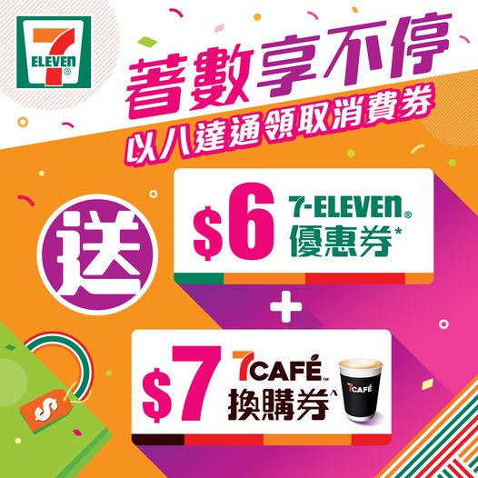 於10月1日至10月5日期間,在7-Eleven分店使用八達通領取消費券,即可獲贈2張3元優惠券,以及1張「7CAFÉ」7元換購券。優惠視乎各分店的供應而定,換完或售完即止。兩款優惠券有效期至10月12日。