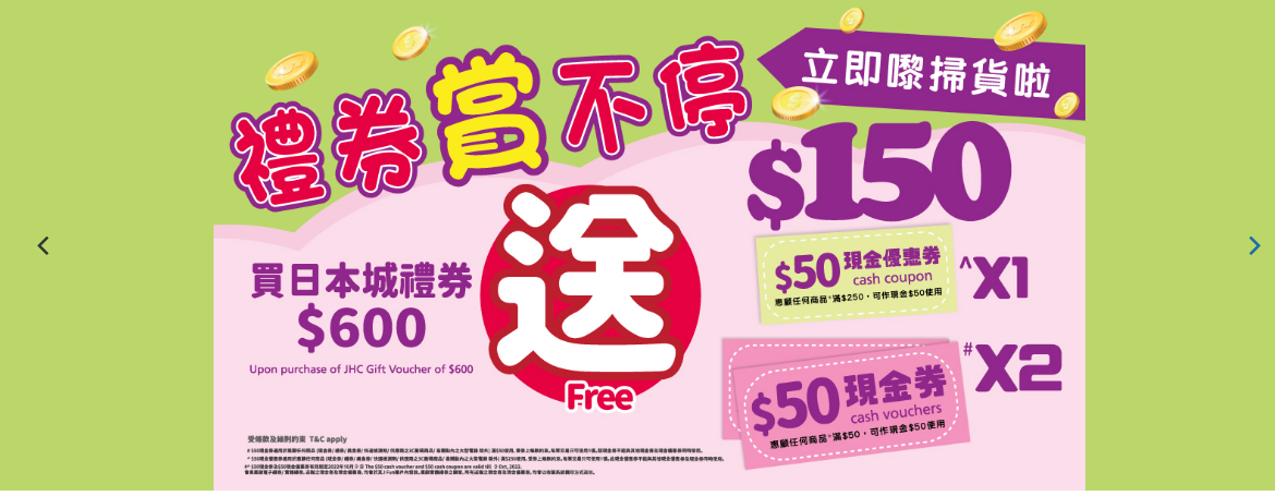即日起購買日本城禮券滿600元,即送150元優惠券及現金券(2張50元現金券+1張50元現金優惠券)。優惠券及現金券有效期至2022年10月9日。