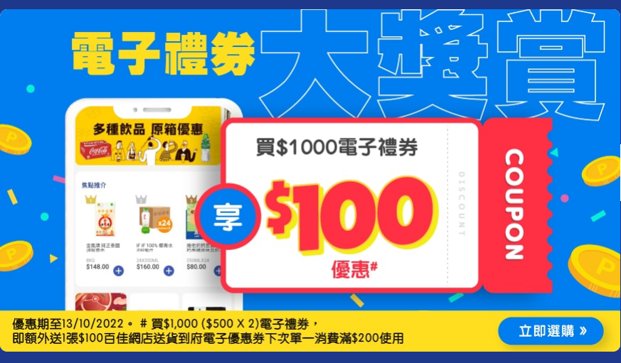 此外,由即日起至10月13日,於百佳網店買500元百佳電子禮券,滿1000元送100元電子優惠券,電子優惠券於下次消費滿200元即可使用。