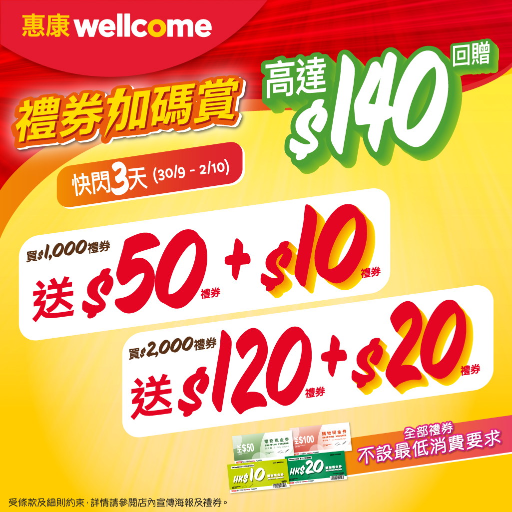 由9月30日至10月13日,於惠康分店購買現金券即享額外回贈:買1000元現金券即送50元現金券;買2000元現金券更送120元現金券。