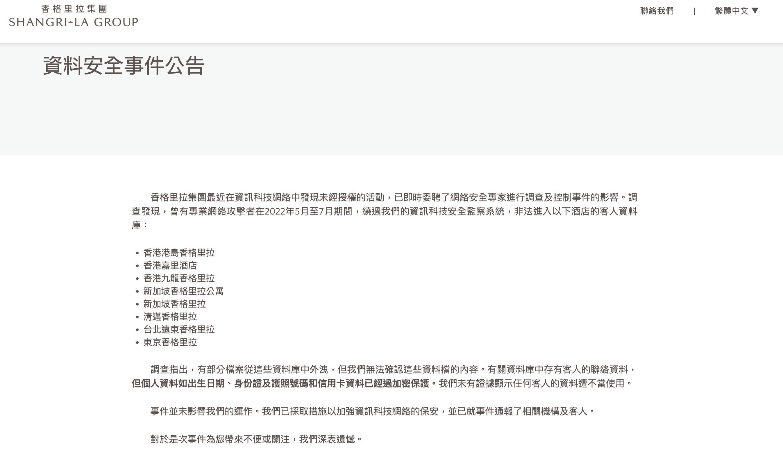 至於有多少客人的資料受到影響,集團指,調查未能確定外洩資料檔的內容。不過,香格里拉表示,資料庫存有客人的聯絡資料,但出生日期、身份證及護照號碼和信用卡資料等,已經過加密保護,暫時未有證據顯示有客人的資料遭到不當使用。