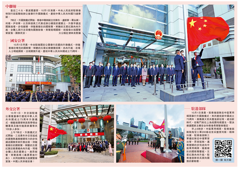 10月1日早晨,中央駐港國安公署舉行莊嚴的升旗儀式,伴隨着雄壯嘹亮的國歌聲,鮮艷的五星紅旗獵獵招展,冉冉升起。在場人士唱起國歌,注視國旗升起,慶祝中華人民共和國成立73周年。