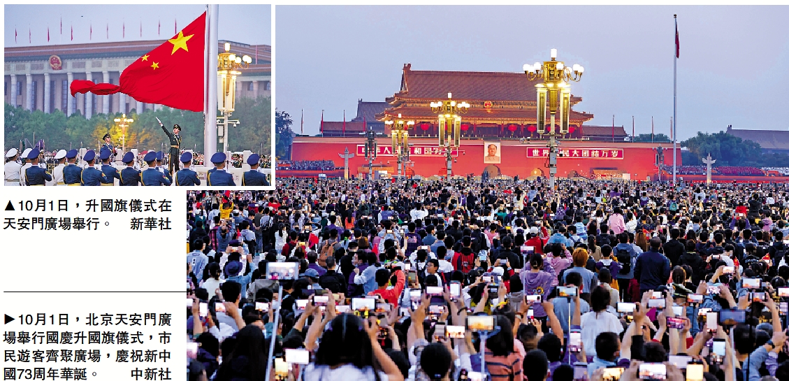 (大公報記者 張帥)10月1日,中華人民共和國迎來73歲生日。日出東方,叩啟蒼穹。上午6時許,天安門廣場舉行國慶升國旗儀式,在嚴格落實疫情防控政策要求和個人防護措施下,共計有21.8萬名市民遊客齊聚天安門廣場,迎着清晨第一縷陽光,共同見證五星紅旗冉冉升起的莊嚴時刻,慶祝新中國73周年華誕。