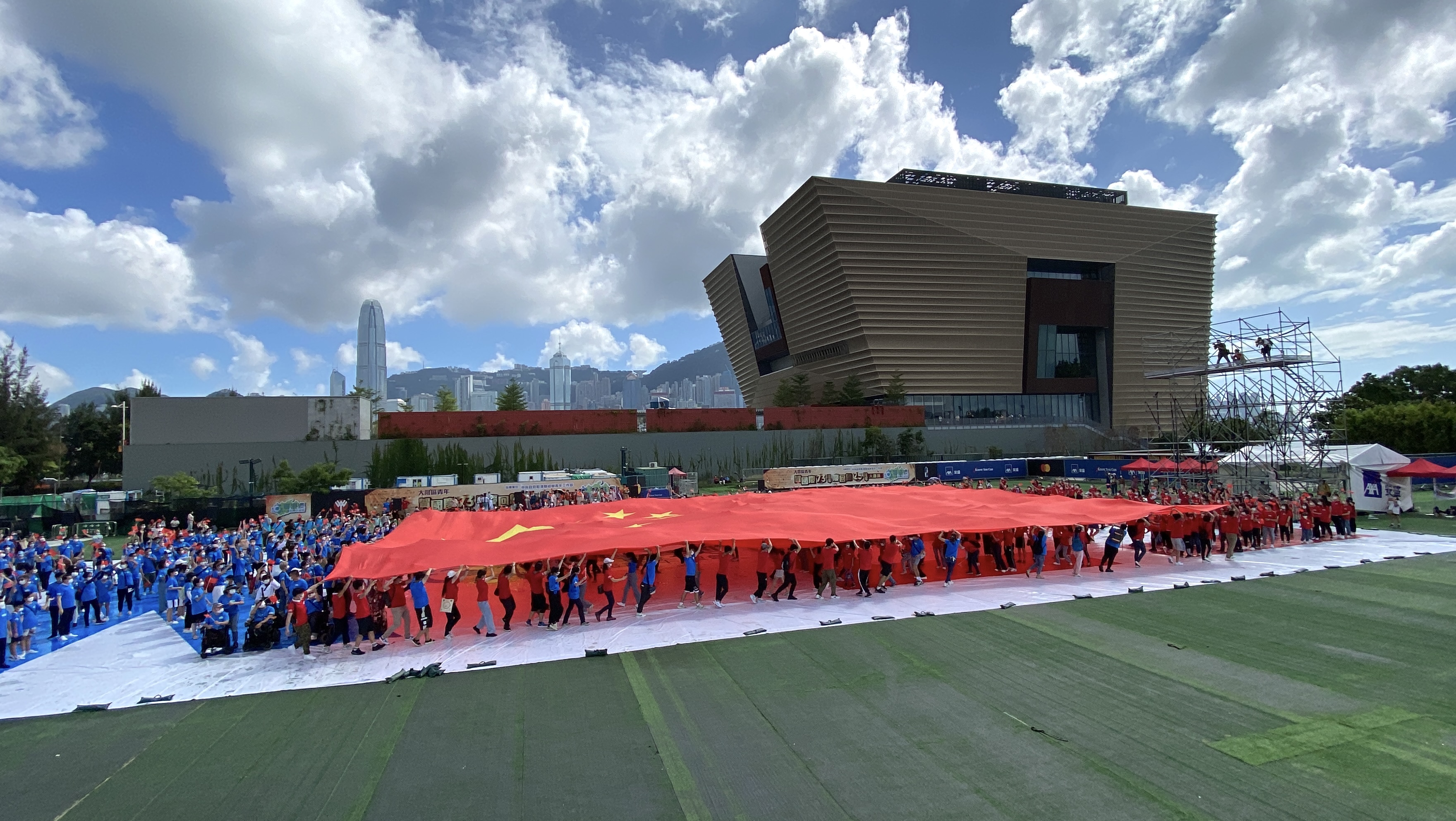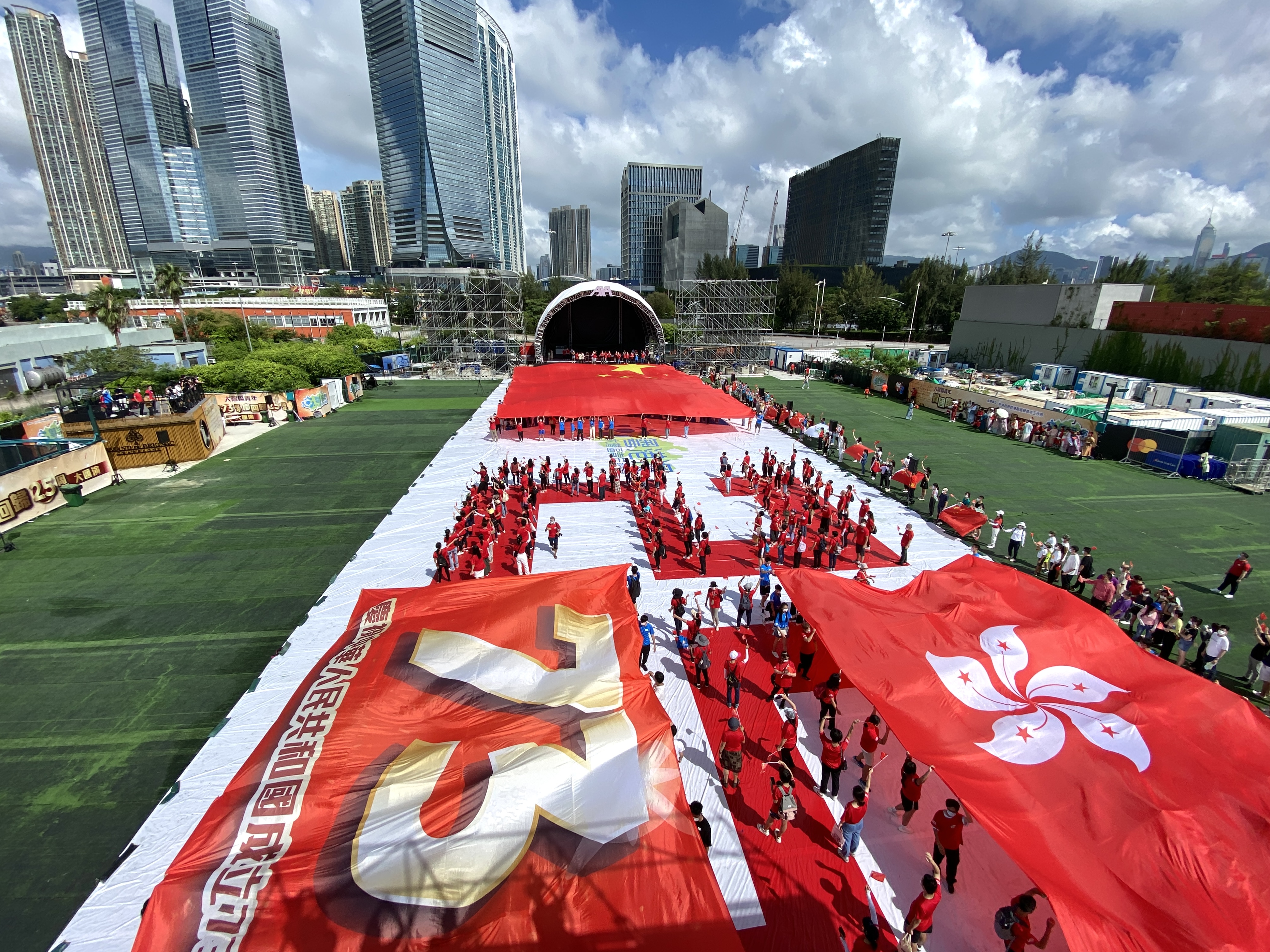 活動現場洋溢着熱烈歡快的氣氛,在開場秀表演中,約100名青年護旗手分別展開及舉起巨型國旗、區旗,逾萬平方米的會場變成一片紅色的海洋。同時,現場參與者拼湊出大型「HK25」方陣,多架無人機於高空進行多角度航拍,場面精彩震撼。