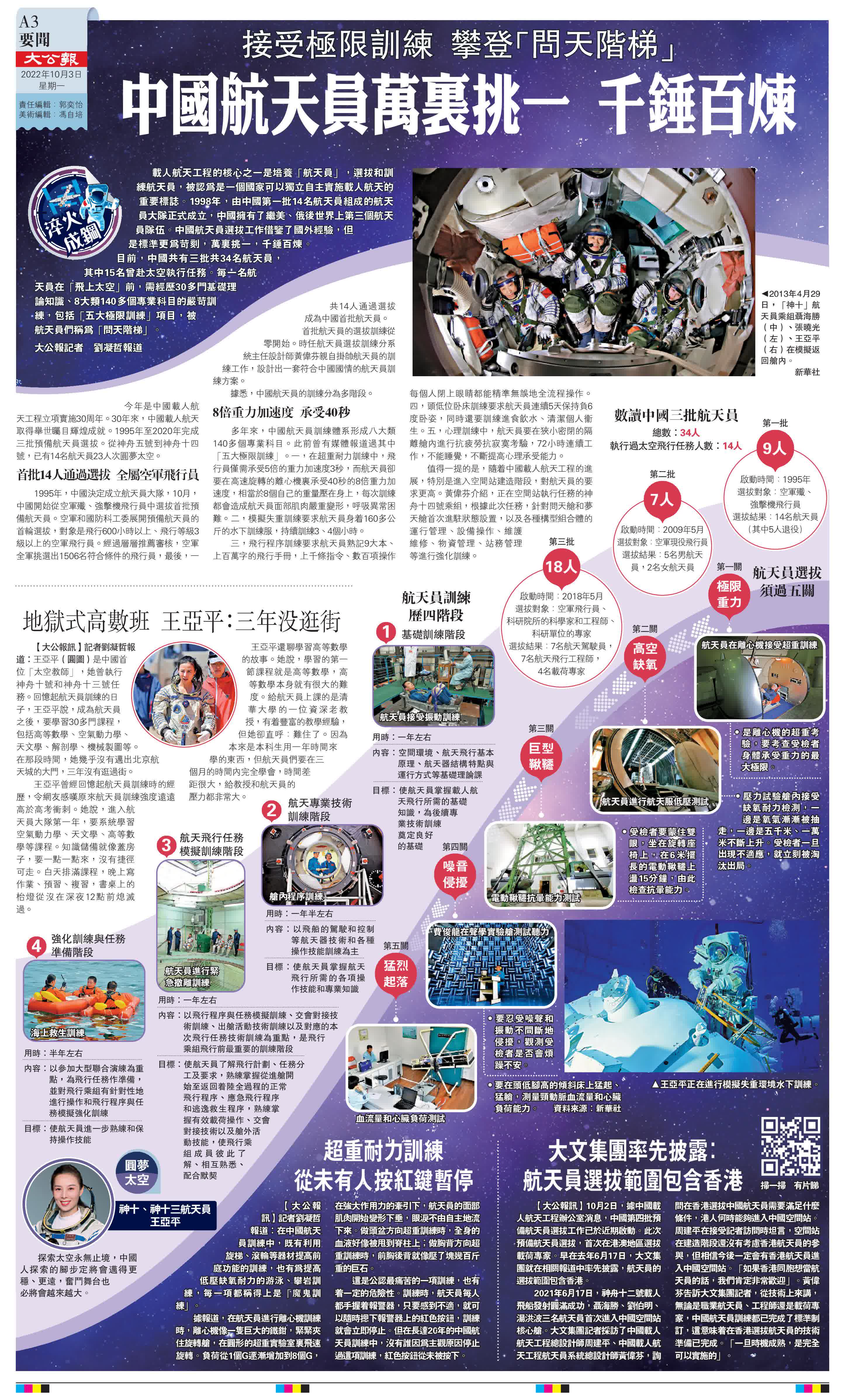 (大公報記者 劉凝哲 報道)載人航天工程的核心之一是培養「航天員」,選拔和訓練航天員,被認為是一個國家可以獨立自主實施載人航天的重要標誌。1998年,由中國第一批14名航天員組成的航天員大隊正式成立,中國擁有了繼美、俄後世界上第三個航天員隊伍。中國航天員選拔工作借鑒了國外經驗,但是標準更為苛刻,萬裏挑一,千錘百煉。目前,中國共有三批共34名航天員,其中15名曾赴太空執行任務。每一名航天員在「飛上太空」前,需經歷30多門基礎理論知識、8大類140多個專業科目的嚴苛訓練,包括「五大極限訓練」項目,被航天員們稱為「問天階梯」。