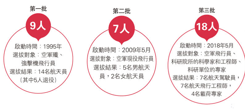 1995年,中國決定成立航天員大隊,10月,中國開始從空軍殲、強擊機飛行員中選拔首批預備航天員。空軍和國防科工委展開預備航天員的首輪選拔,對象是飛行600小時以上、飛行等級3級以上的空軍飛行員。經過層層推薦審核,空軍全軍挑選出1506名符合條件的飛行員,最後,一共14人通過選拔成為中國首批航天員。