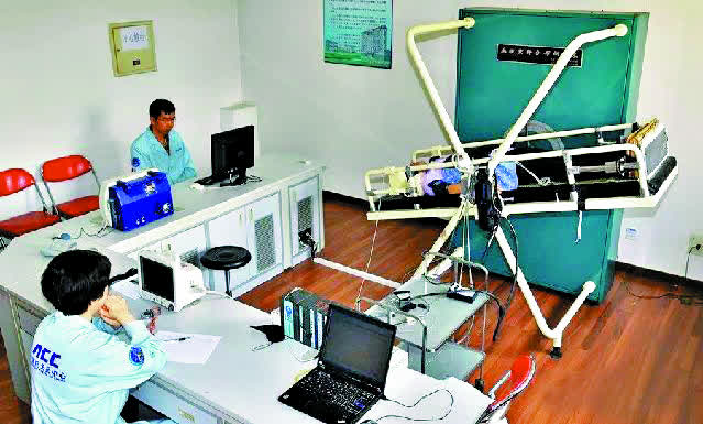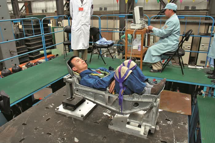 要在頭低腳高的傾斜床上猛起、猛躺,測量頸動脈血流量和心臟負荷能力。(資料來源:新華社)