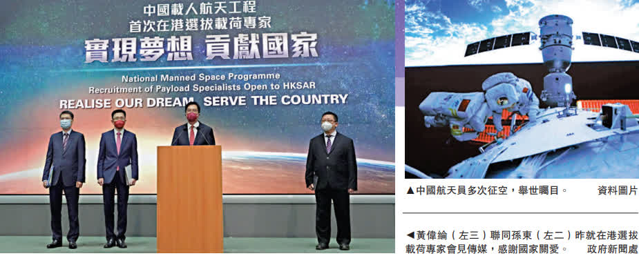 (大公報記者 鍾怡)國家宣布啟動第四批預備航天員選拔工作,首次在香港選拔載荷專家。特區政府昨日表示將安排初選招募期,即今年的10月6日(本周四)至27日。申請人需符合年齡、體格方面的要求,以及要在相關的專業領域擁有博士學位,並且專業經驗不少於三年。