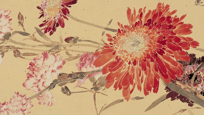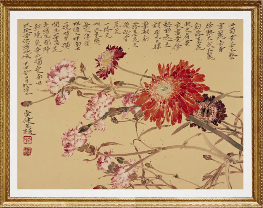 「這幅作品是我比較典型的一幅沒骨花卉的作品。這個花卉是在花店裏買的幾種花,把它組合起來。」