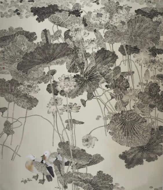 「這幅作品(《寒塘幽韻》)是我最大的一幅沒骨花鳥畫,大概2米寬,2.2米高。它是運用一種水墨畫的創作的思維方式,就是說我想到哪兒畫到哪兒,這種靈感就是不期而遇,它不是理性的,它完全是感性的。」