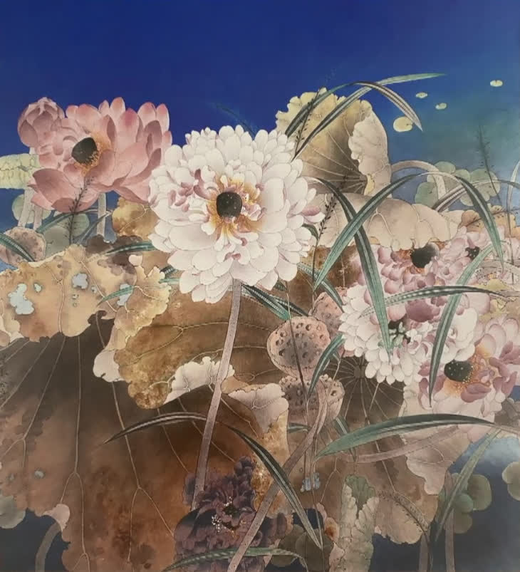 「這幅作品(《碧水金荷》)非常有特點,一是構圖非常飽滿,色彩非常絢爛,表面上看是表現了自然的真實,實際上它是自然對荷塘、荷花的很多主觀的一些想像。」