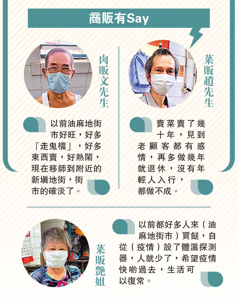 面對日漸冷清的街市,吉檔連連,藍哥顯得有點不甘心,自動獻上良方妙策,直言將街市改頭換面,提供年輕人創業的空間,「街市租金平,可以平租給年輕人開檔,讓他們實踐及累積零售經驗,日後可找店舖或街舖繼續營業。」此外,他又指中年人可以此賺外快,老年人亦可投一個檔位「過吓日晨」,維持半退休的狀態,「所以油麻地街市更老更舊,都有保存的價值,我們都希望生活平穩!」
