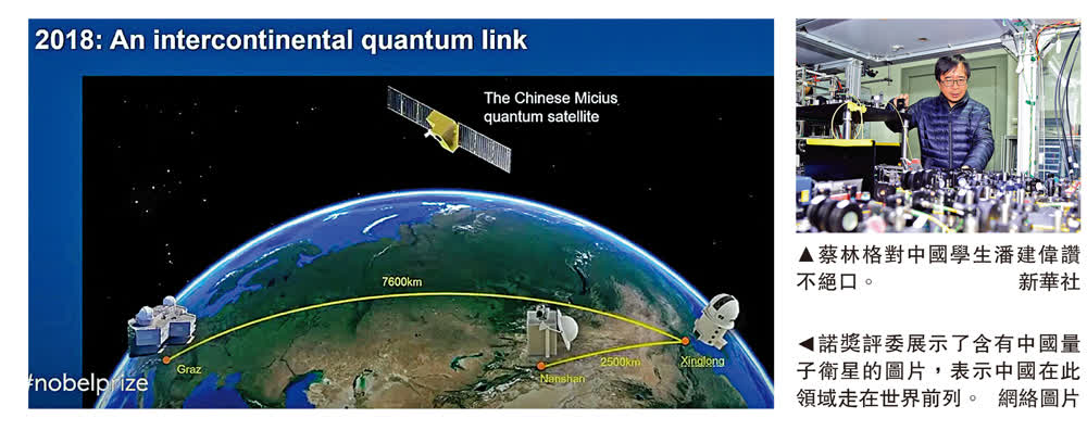 獲得今年諾貝爾物理學獎的蔡林格教授,是中國科學院院士潘建偉的博士生導師。2016年,潘建偉領銜研製的全球首顆量子科學實驗衛星「墨子號」發射升空,蔡林格教授也來到酒泉衛星發射中心觀看。他曾在接受採訪時稱讚中國在量子通信領域的成就令人矚目,「愛因斯坦一定會對此感到驚訝」。