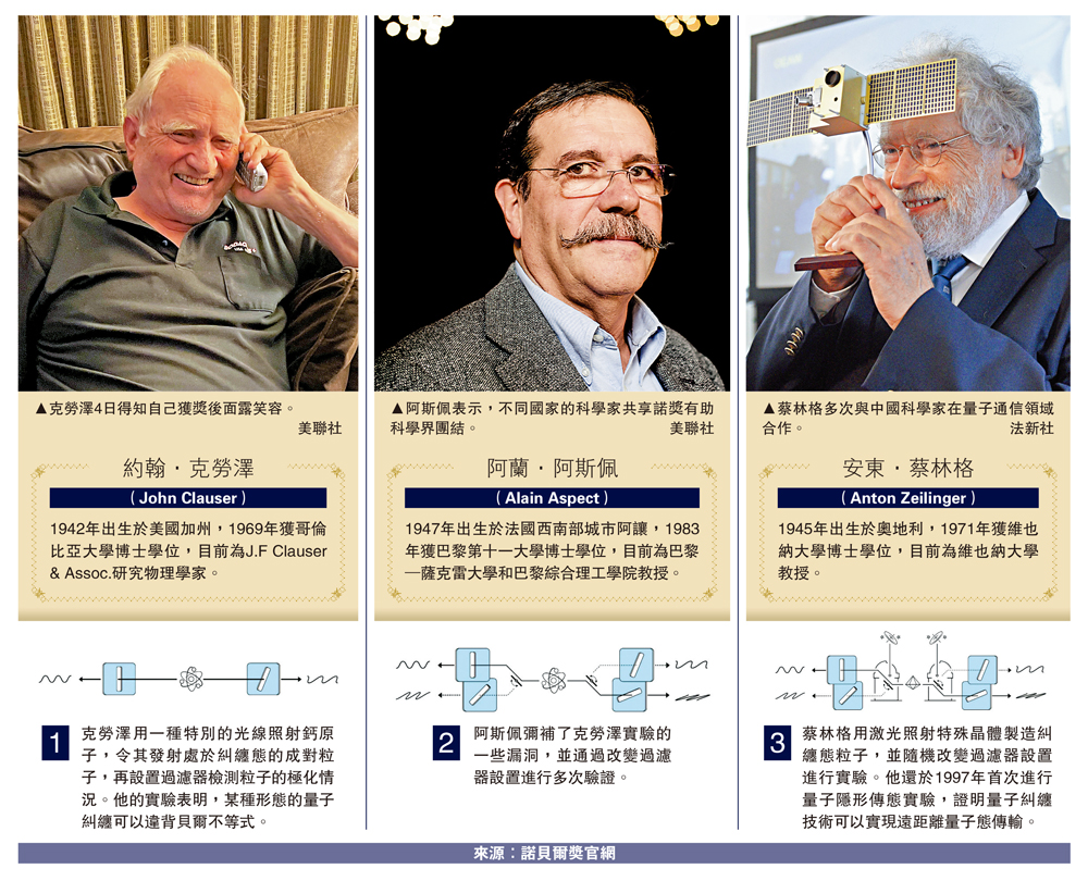 大公報綜合《紐約時報》、法新社及新華社報道:瑞典皇家科學院4日宣布將2022年諾貝爾物理學獎授予法國科學家阿蘭·阿斯佩、美國科學家約翰·克勞澤和奧地利科學家安東·蔡林格,以表彰他們在「糾纏光子實驗、驗證違反貝爾不等式和開創量子信息科學」方面所做出的貢獻。當天在解讀獲獎成果時,評委漢森展示了一張含有中國量子衛星的圖片,並表示中國在量子衛星和量子通信研究方面走在世界前列。