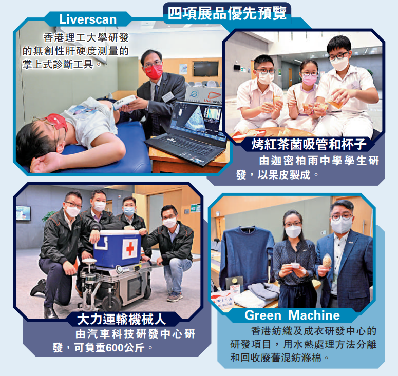 預覽會上介紹了其中四個參展發明,包括無創性肝硬度測量的掌上式診斷工具──Liverscan、用水熱處理方法分離和回收廢舊混紡滌棉的Green Machine、大力運輸機械人,據悉這三個項目皆在「創新及科技基金」資助下進行。