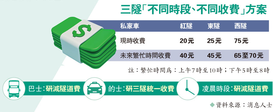 為緩解三隧車流量失衡的問題,消息指特區政府擬在西隧專營權明年8月屆滿後,調整三隧收費,擬在繁忙時段,包括早上7時至10時,以及傍晚5時至晚上8時,將紅隧和東隧的私家車收費加價20元,分別加至40元和45元;西隧則減價,初步建議會減5元至10元,即是減到65元至70元。