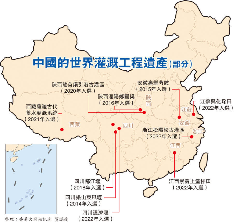中國地理廣博,地形地貌多樣,從地理空間而言,這些被列入「世界灌溉工程遺產」名錄的中國灌溉古跡,遍布長江、黃河流域,囊括10多個省份;從地形地貌而言,涵蓋平原、丘陵、山地,甚至被稱為世界屋脊的青藏高原;就功能而言,有防海水鹹潮倒灌的、有引江河水灌溉的、有立體增加播種面積和降低播種難度的、亦有調節河道旱澇的,不一而足;從時間上看,則自先秦至明清凡2,000餘年,於沿襲各朝代都有修葺和擴容,至今仍在發揮着不可替代的作用。