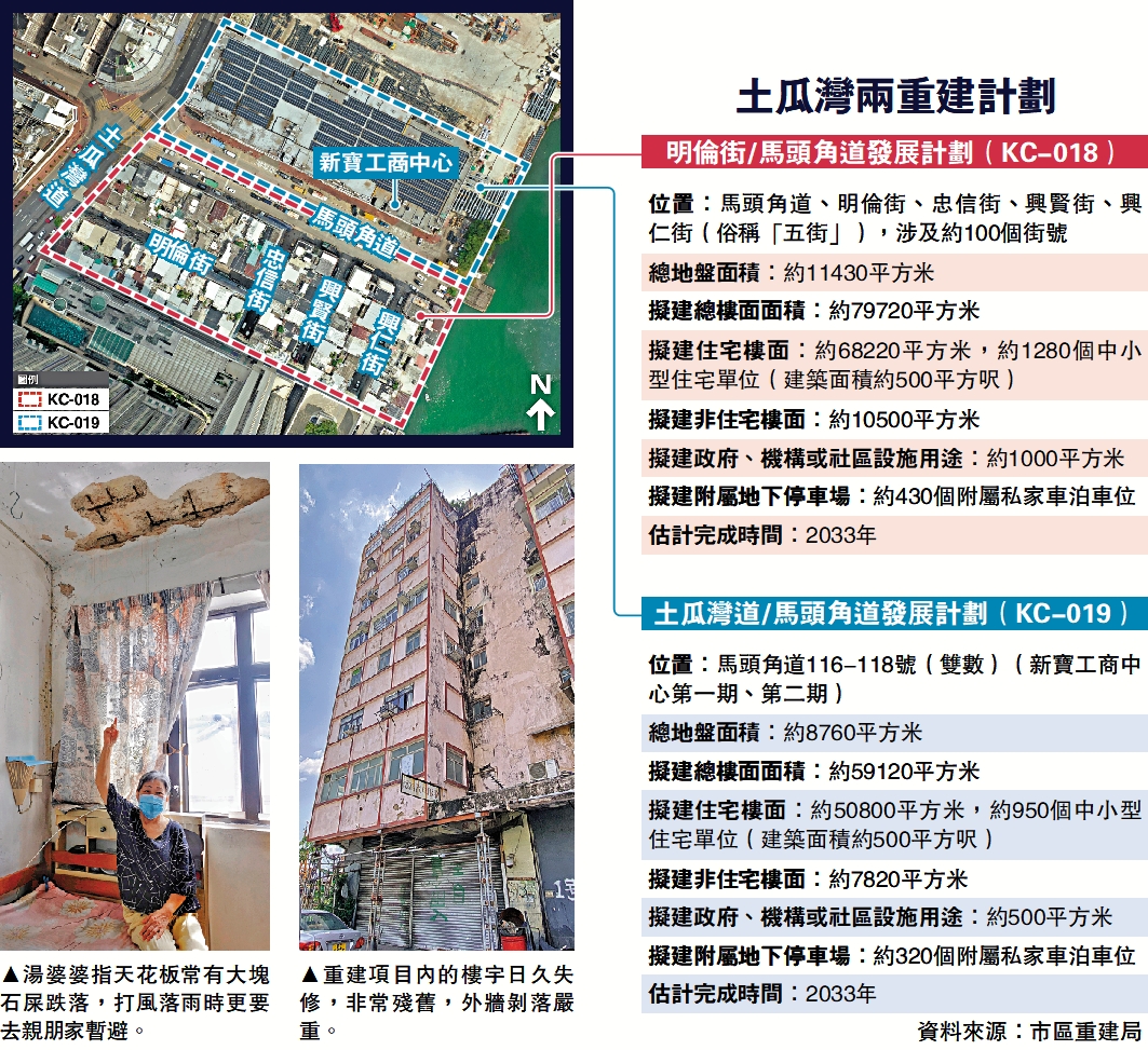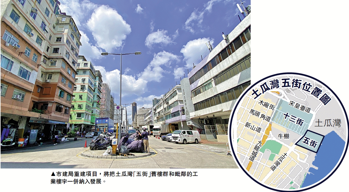 (大公報記者 王亞毛<文> 蔡文豪<圖>)市區重建局昨日宣布啟動兩個位於土瓜灣的重建項目,包括有多幢60年樓齡、飽受石屎剝落與滲水問題困擾的「五街」,以及新寶工商中心兩幢工廈。市建局預料,兩項目於2033年落成,重建後可提供約2230個單位,總發展成本超過100億元。由於位於海濱,重建後住宅樓宇可坐擁無敵海景。