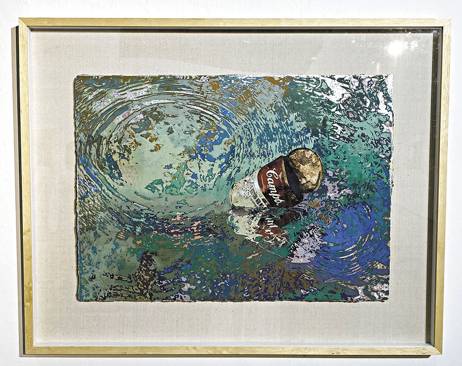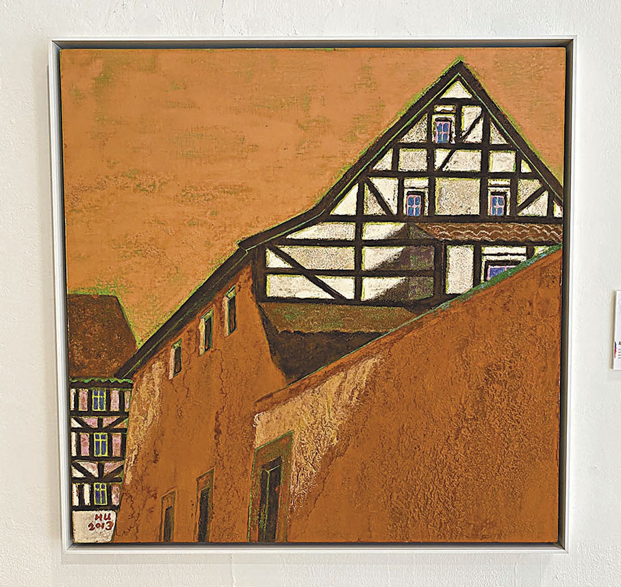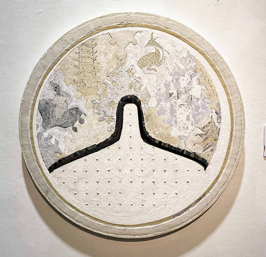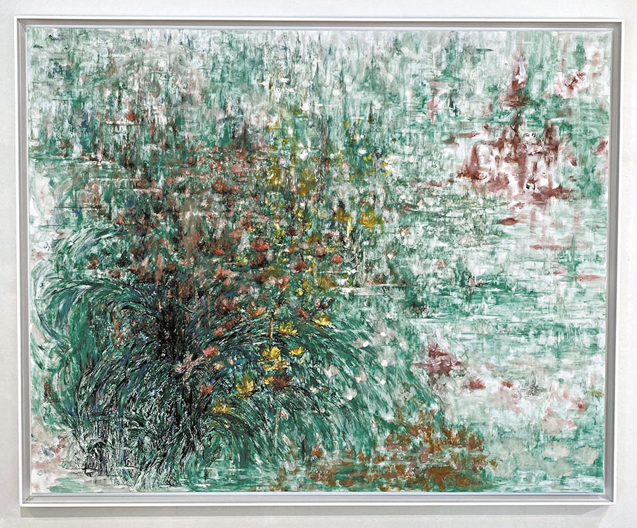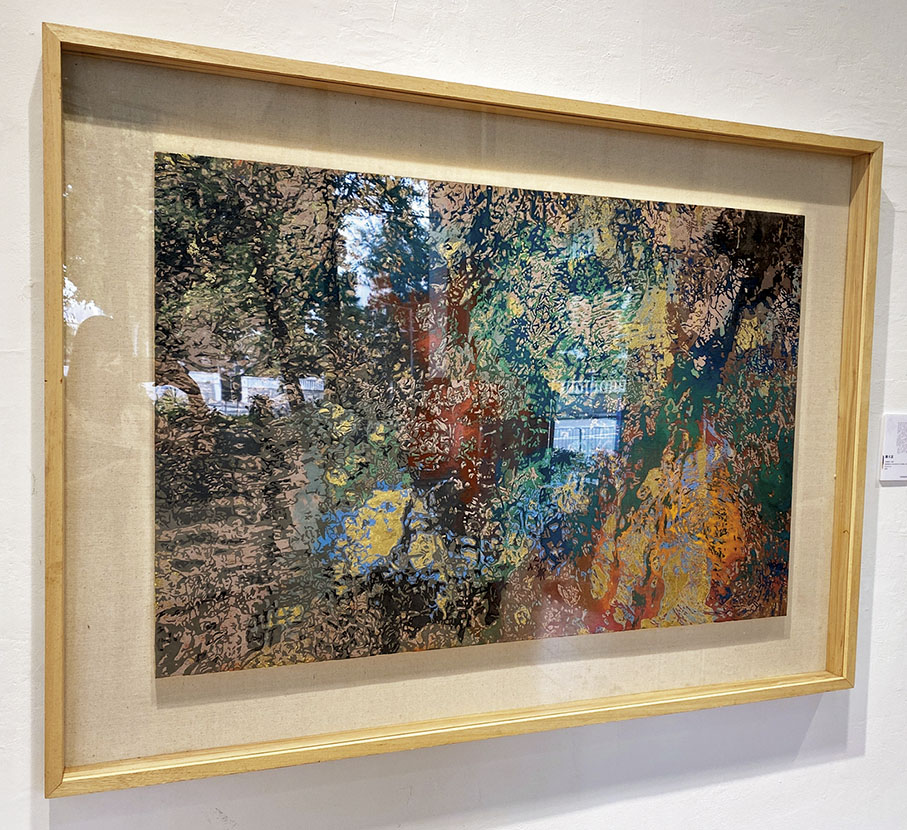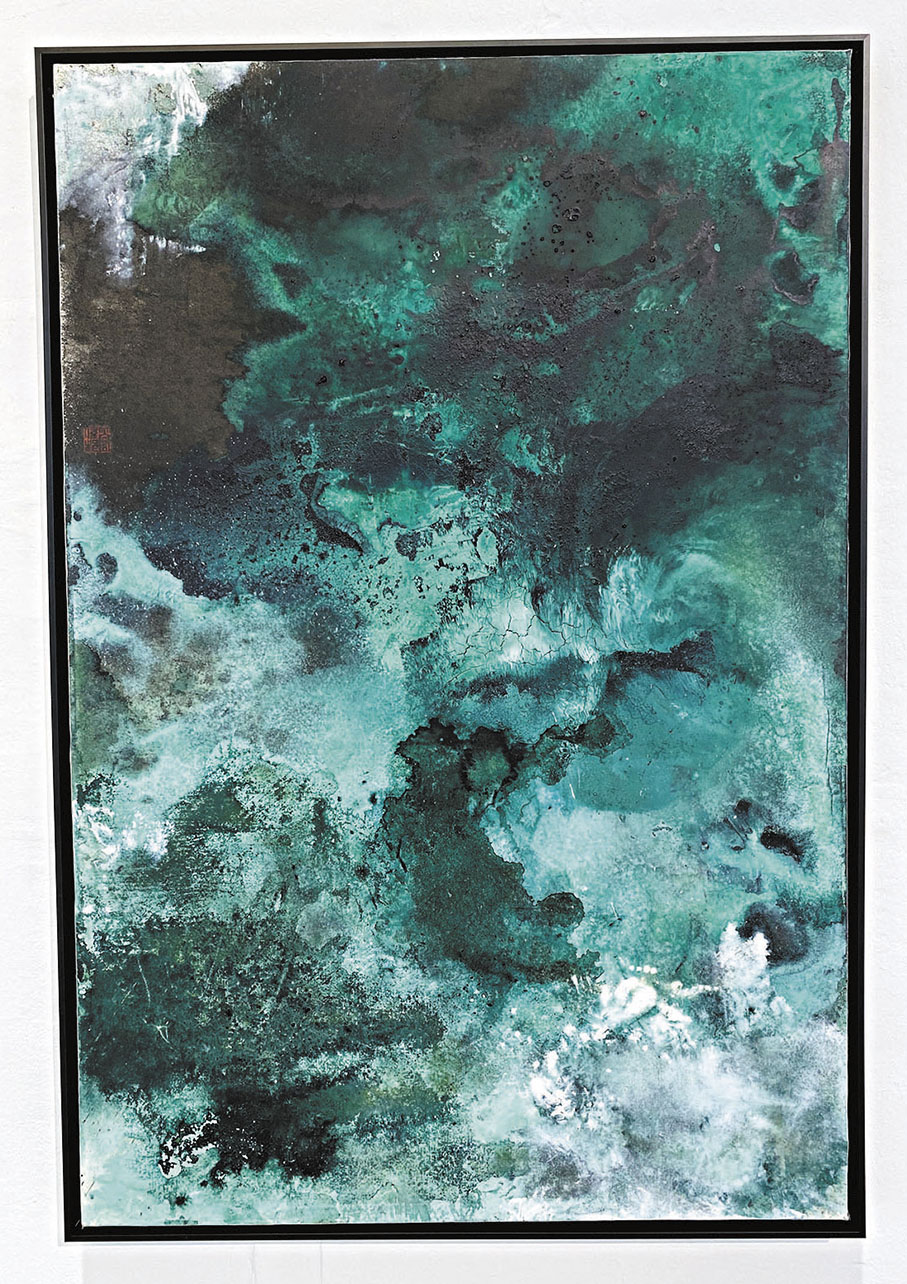 朱秋慧的《浮動花園》是其於今年創作的作品,身兼岩彩學會副會長的朱秋慧在現場向記者分享作品的創作理念,「我想用岩彩來表現印象派的感覺,因此我希望作品可以呈現出戶外陽光與油彩結合的效果。岩彩有反光、變色的感覺,能藉此特性塑造如印象派的作品。」朱秋慧用石膏和岩彩混合創作出此作品。