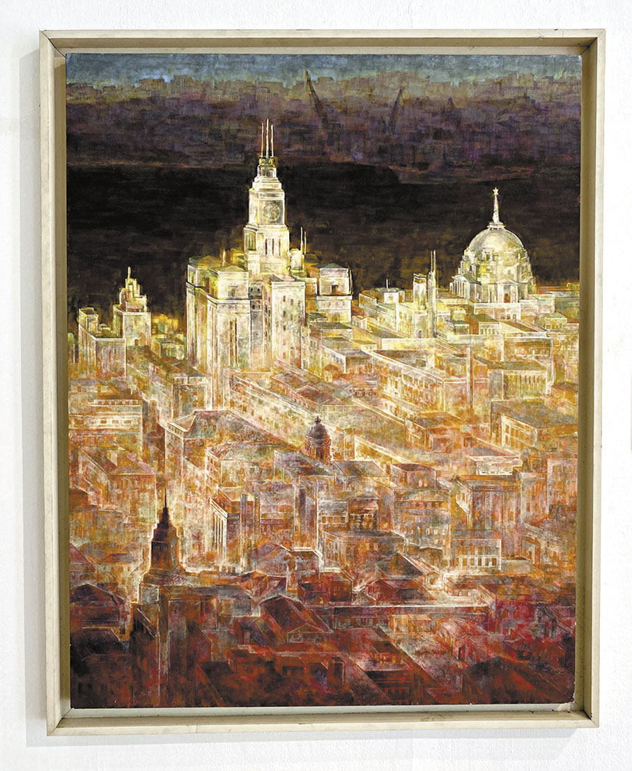 《不夜城——上海》是卓民在1994年創作的作品,他在上海出世,於日本修讀藝術學系。他所繪畫的上海正值於改革開放前的時期,他認為上海是一個黃金之都,因此在創作時運用了金色的顏料繪畫上海的樣貌。作品描繪細膩,建築物的線條勾畫在作品上,作品上下方大面積地使用了暗沉色彩,襯托起作品中央的金色顏料,更顯華麗之感。