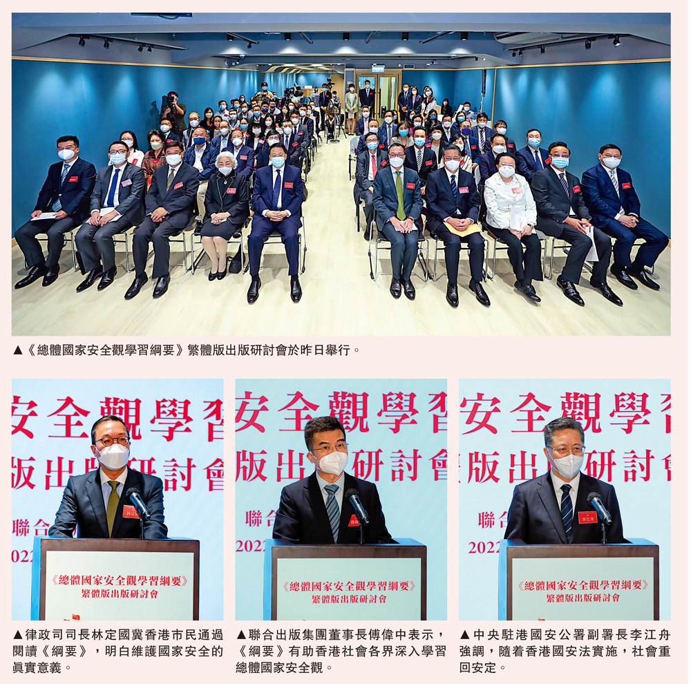 (大公報記者 吳俊宏)在慶祝中華人民共和國成立73周年、喜迎黨的二十大勝利召開之際,《總體國家安全觀學習綱要》(《綱要》)繁體版出版研討會於昨日舉辦。《綱要》全面反映了習近平新時代中國特色社會主義思想在國家安全方面的原創性貢獻,為香港社會各界深入學習總體國家安全觀、共同維護國家安全提供了權威學習讀物。