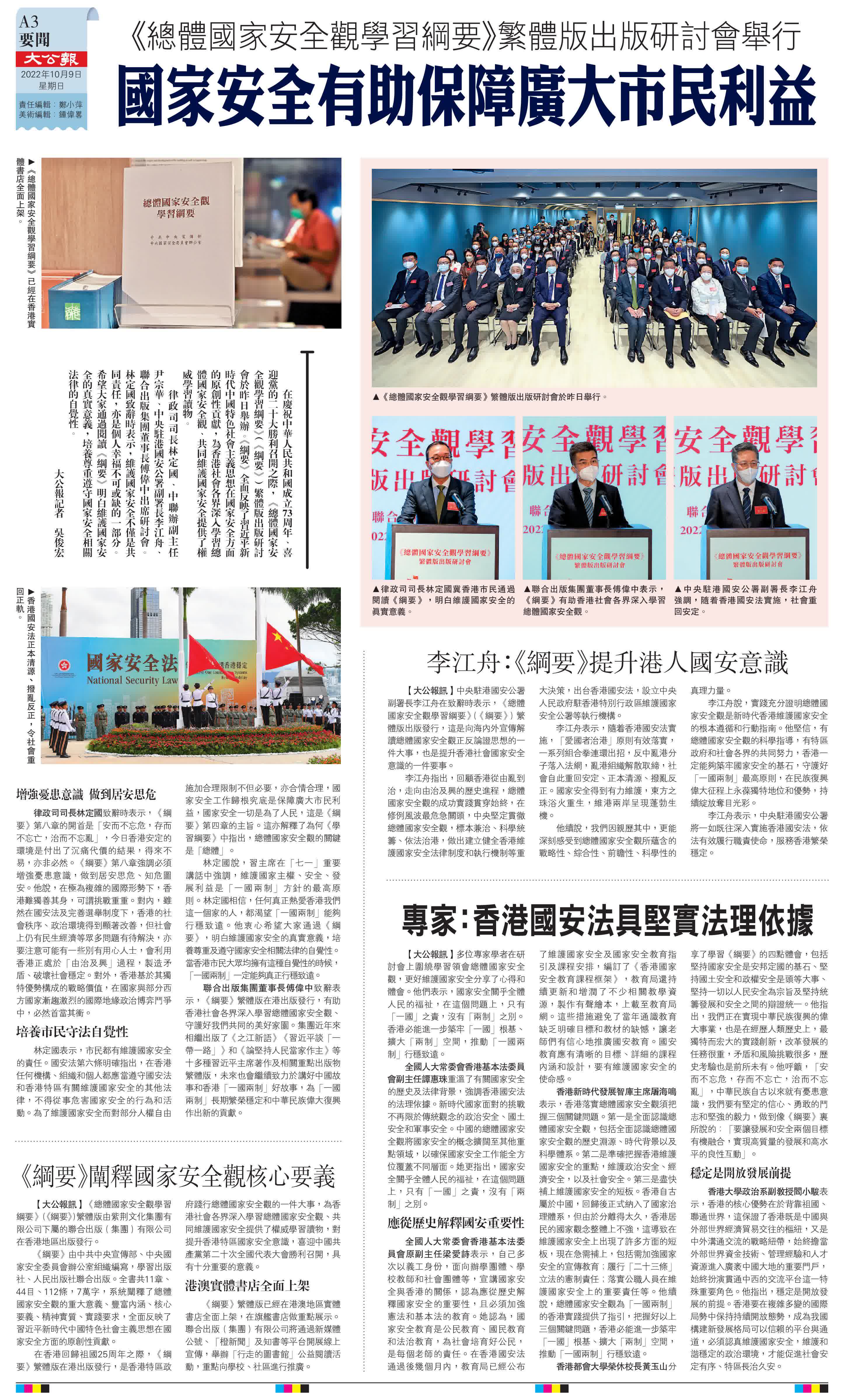 在香港回歸祖國25周年之際,《綱要》繁體版在港出版發行,是香港特區政府踐行總體國家安全觀的一件大事,為香港社會各界深入學習總體國家安全觀、共同維護國家安全提供了權威學習讀物,對提升香港特區國家安全意識,喜迎中國共產黨第二十次全國代表大會勝利召開,具有十分重要的意義。