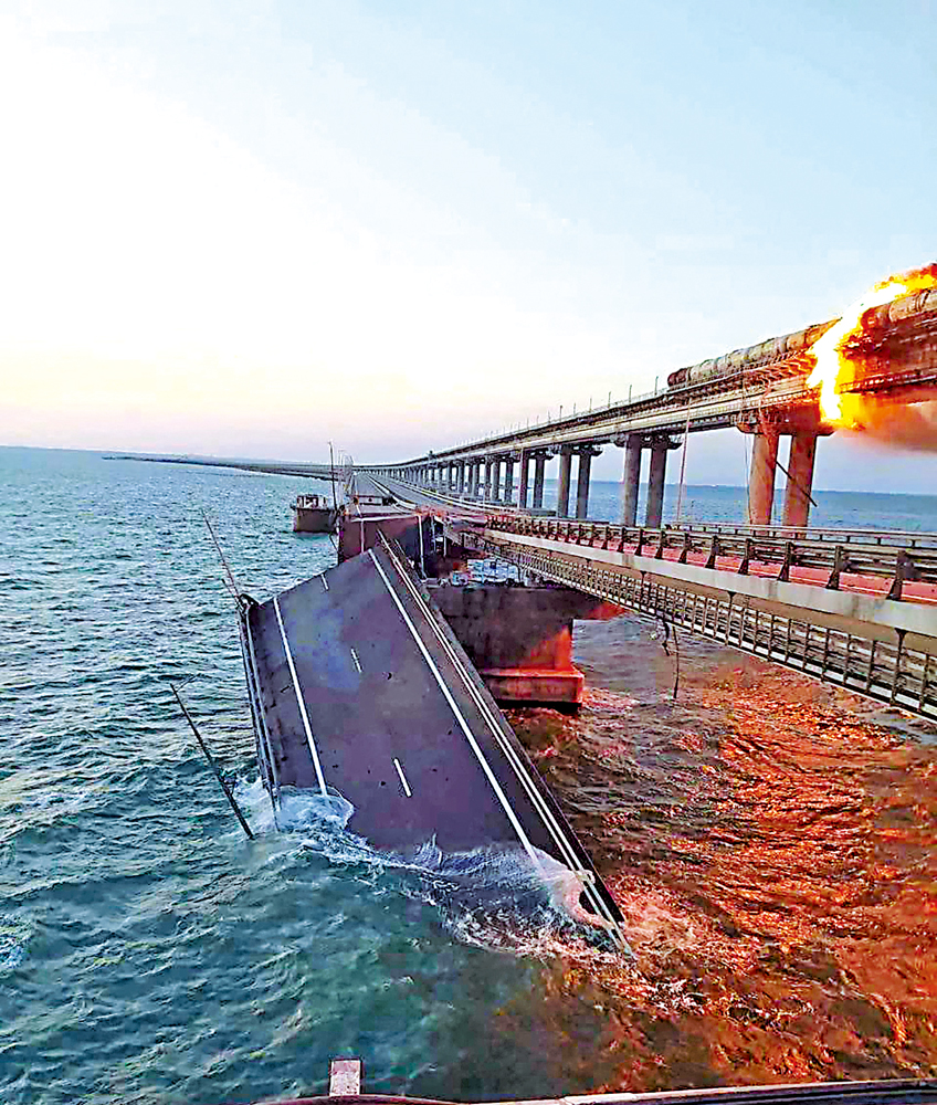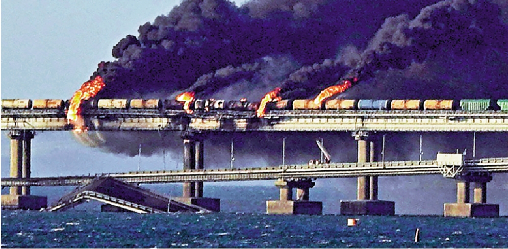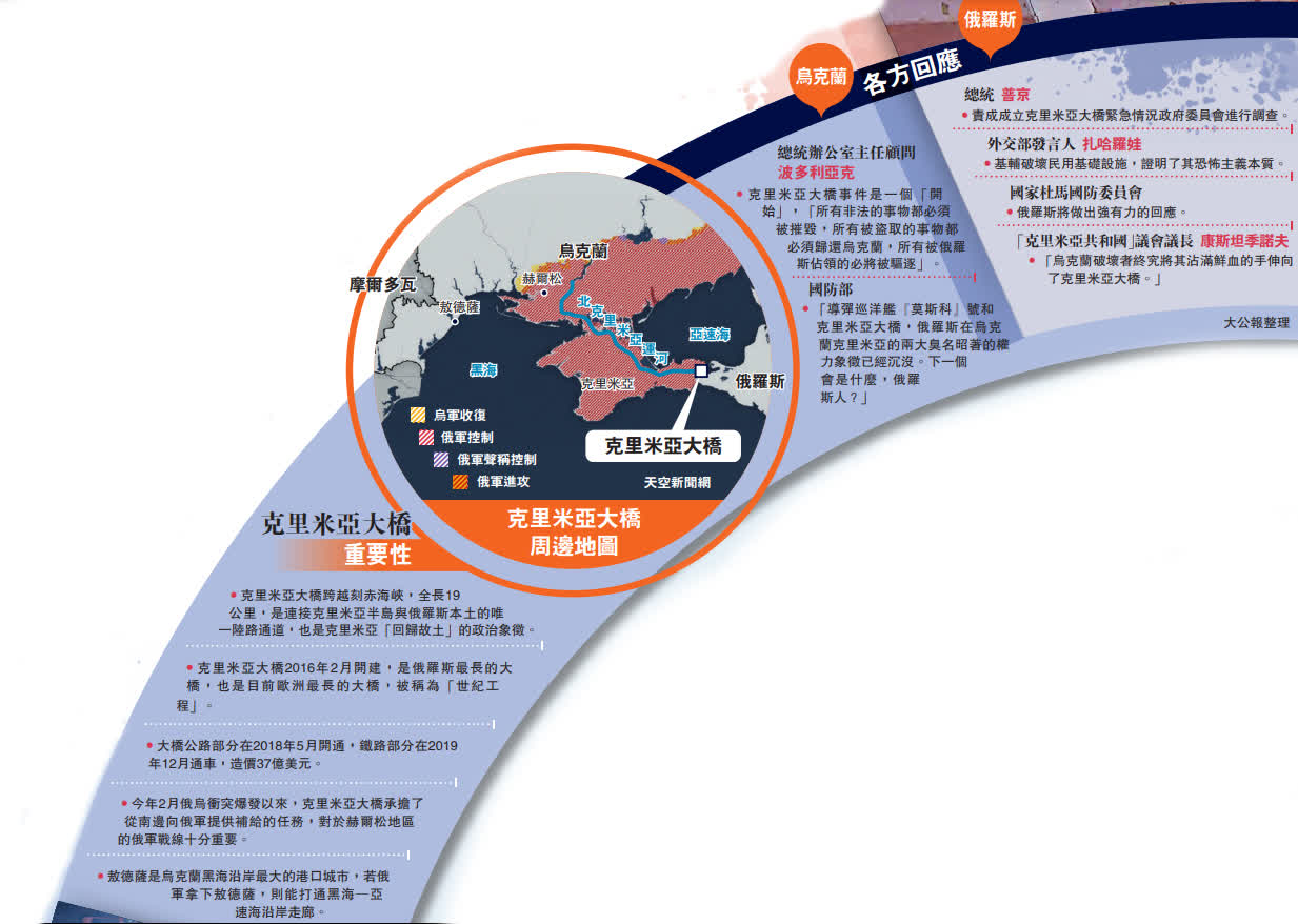 大公報綜合美聯社、《華盛頓郵報》、俄新社報道:當地時間8日清晨,連接克里米亞半島與俄羅斯本土的唯一陸路通道——克里米亞大橋公路橋上一輛貨車發生爆炸,導致與公路橋並行的鐵路橋上一列貨運車上七個油罐起火;公路橋部分路段受損坍塌,至少造成3人死亡。俄外交部當天稱,基輔破壞民用基礎設施,證明了其恐怖主義本質。有烏政府官員向美媒透露,烏克蘭特種部隊是此次襲擊的幕後黑手,但未得到基輔方面證實。