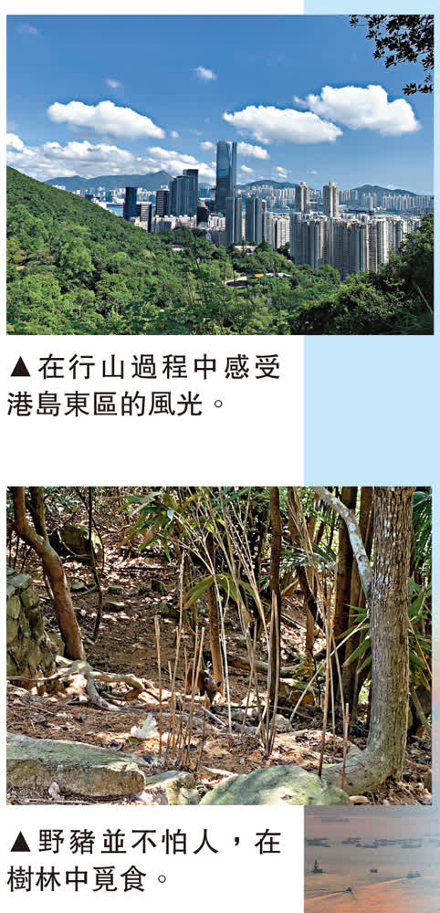 路邊,行過幾個轉彎,便來到一個平台。在這裏有一些座椅和娛樂設施,不少老人在此處乘涼聊天,登高欣賞遠處鱗次櫛比的太古城。一路向前,還可以看到樹叢中的野豬。一頭小野豬悠閒地在樹林中穿行,絲毫不害怕路上的行人。