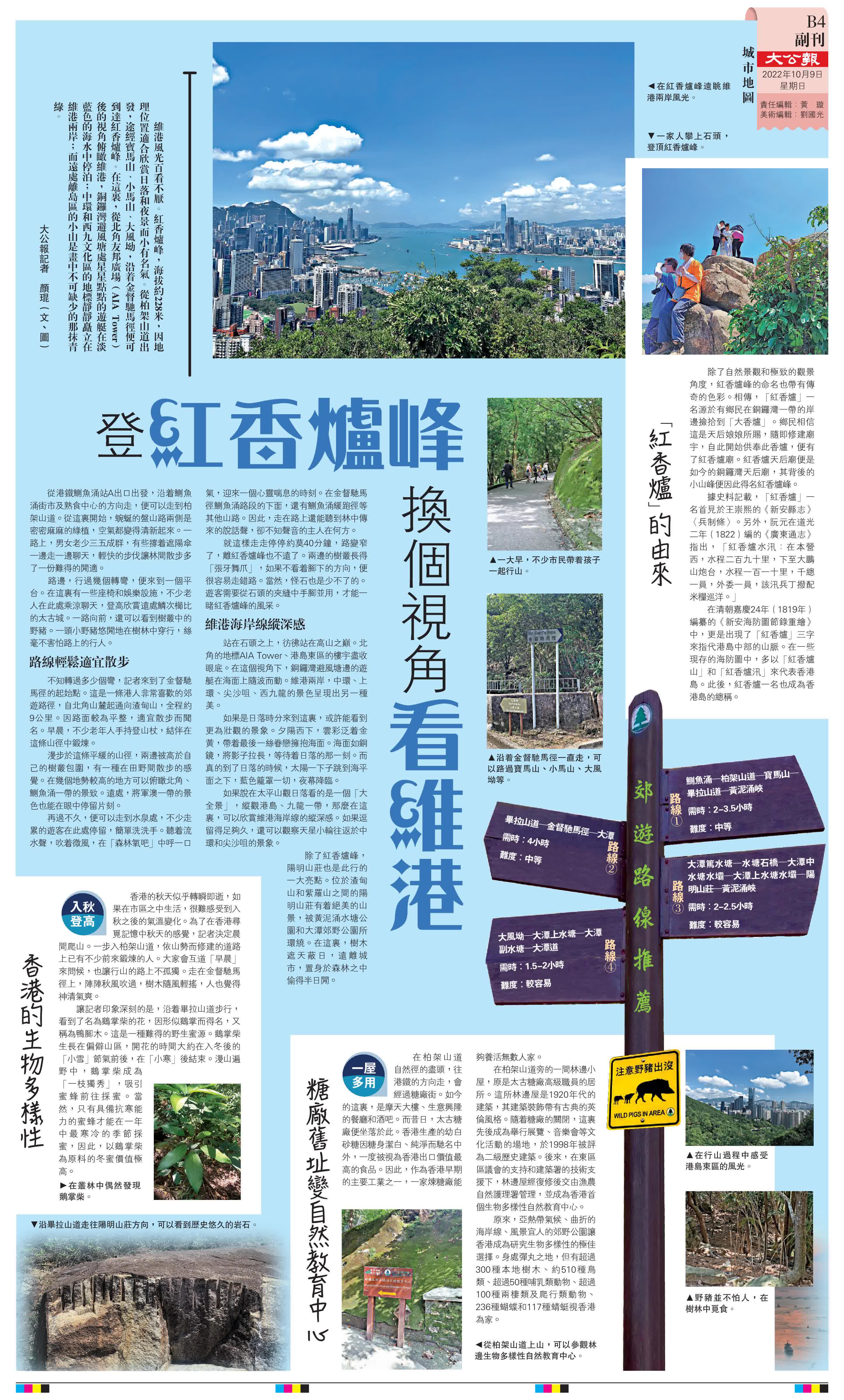(大公報記者 顏琨<文、圖>)維港風光百看不厭。紅香爐峰,海拔約228米,因地理位置適合欣賞日落和夜景而小有名氣。從柏架山道出發,途經寶馬山、小馬山、大風坳,沿着金督馳馬徑便可到達紅香爐峰。在這裏,從北角友邦廣場(AIA Tower)後的視角俯瞰維港,銅鑼灣避風塘處星星點點的遊艇在淡藍色的海水中停泊;中環和西九文化區的地標靜靜矗立在維港兩岸;而遠處離島區的小山是畫中不可缺少的那抹青綠。