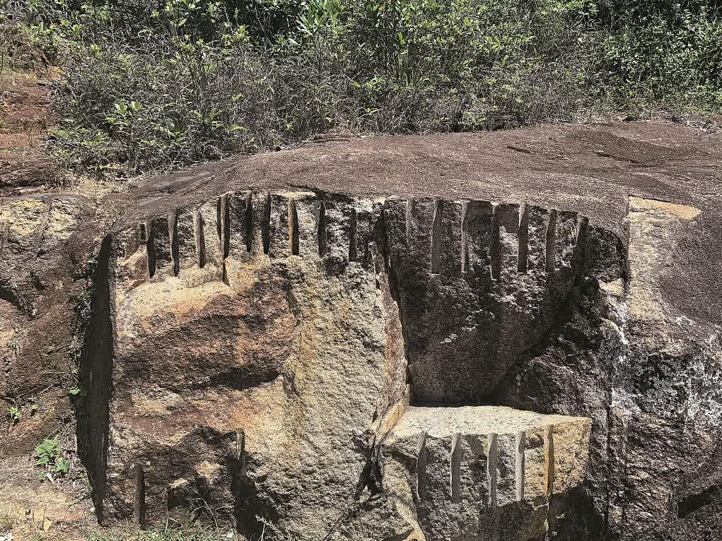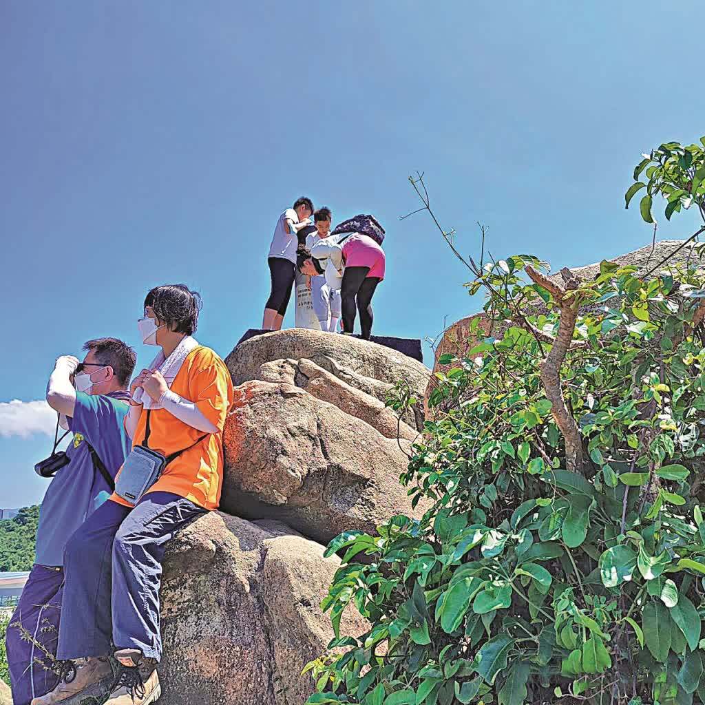 就這樣走走停停約莫40分鐘,路變窄了,離紅香爐峰也不遠了。兩邊的樹叢長得「張牙舞爪」,如果不看着腳下的方向,便很容易走錯路。當然,怪石也是少不了的。遊客需要從石頭的夾縫中手腳並用,才能一睹紅香爐峰的風采。