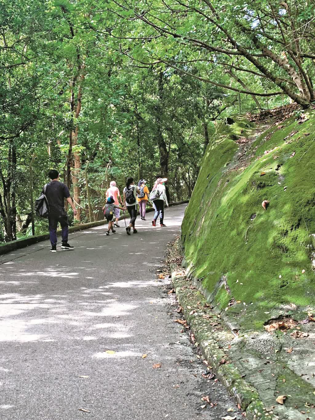 從港鐵鰂魚涌站A出口出發,沿着鰂魚涌街市及熟食中心的方向走,便可以走到柏架山道。從這裏開始,蜿蜒的盤山路兩側是密密麻麻的綠植,空氣都變得清新起來。一路上,男女老少三五成群,有些撐着遮陽傘一邊走一邊聊天,輕快的步伐讓林間散步多了一份難得的閒適。