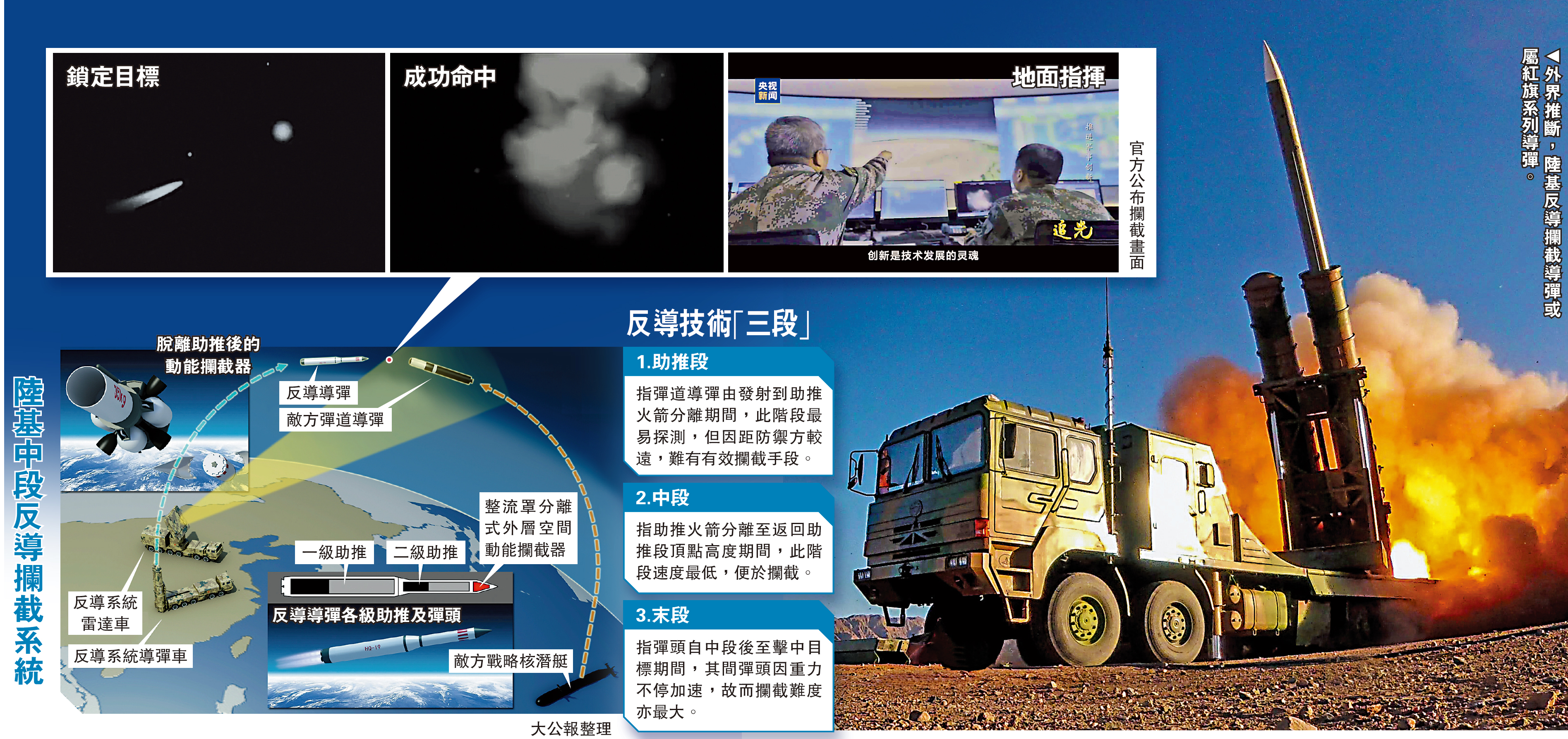 (大公報記者 朱燁 凱雷)10月7日,解放軍首次公布陸基中段反導攔截試驗畫面。解放軍新聞傳播中心官方微博「中國軍號」在貼文中標註「過於先進不宜展示的畫面來了」。這段震撼的陸基中段反導攔截試驗視頻,在央視節目《追光》中首次披露,視頻中攔截導彈直飛大氣層外,摧毀模擬來襲導彈。著名軍事專家宋忠平接受大公報專訪時指出,披露此畫面,表明中國在陸基中段反導攔截中的技術成熟可靠,不僅可以攔截中程彈道導彈,更可以有助於攔截遠程和洲際彈道導彈,對某些妄圖在中國周邊布置導彈的霸權國家形成戰略威懾。