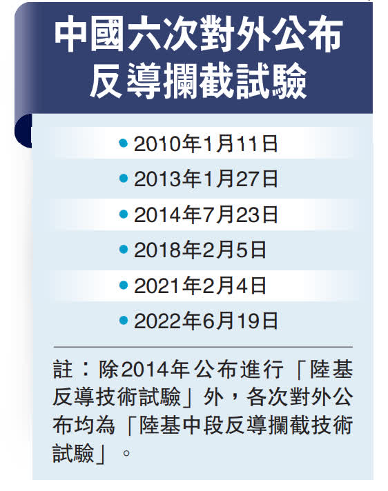 彈道導彈飛行分為三個階段,中段指導彈助推火箭分離後至再入之間的階段,中段反導攔截技術專指在此階段對來襲彈道導彈進行提前預警和攔截的技術。中國國防部曾於2010年1月11日、2013年1月27日、2018年2月5日、2021年2月4日、2022年6月19日5次官宣成功進行陸基中段反導技術試驗或達到預期目的。