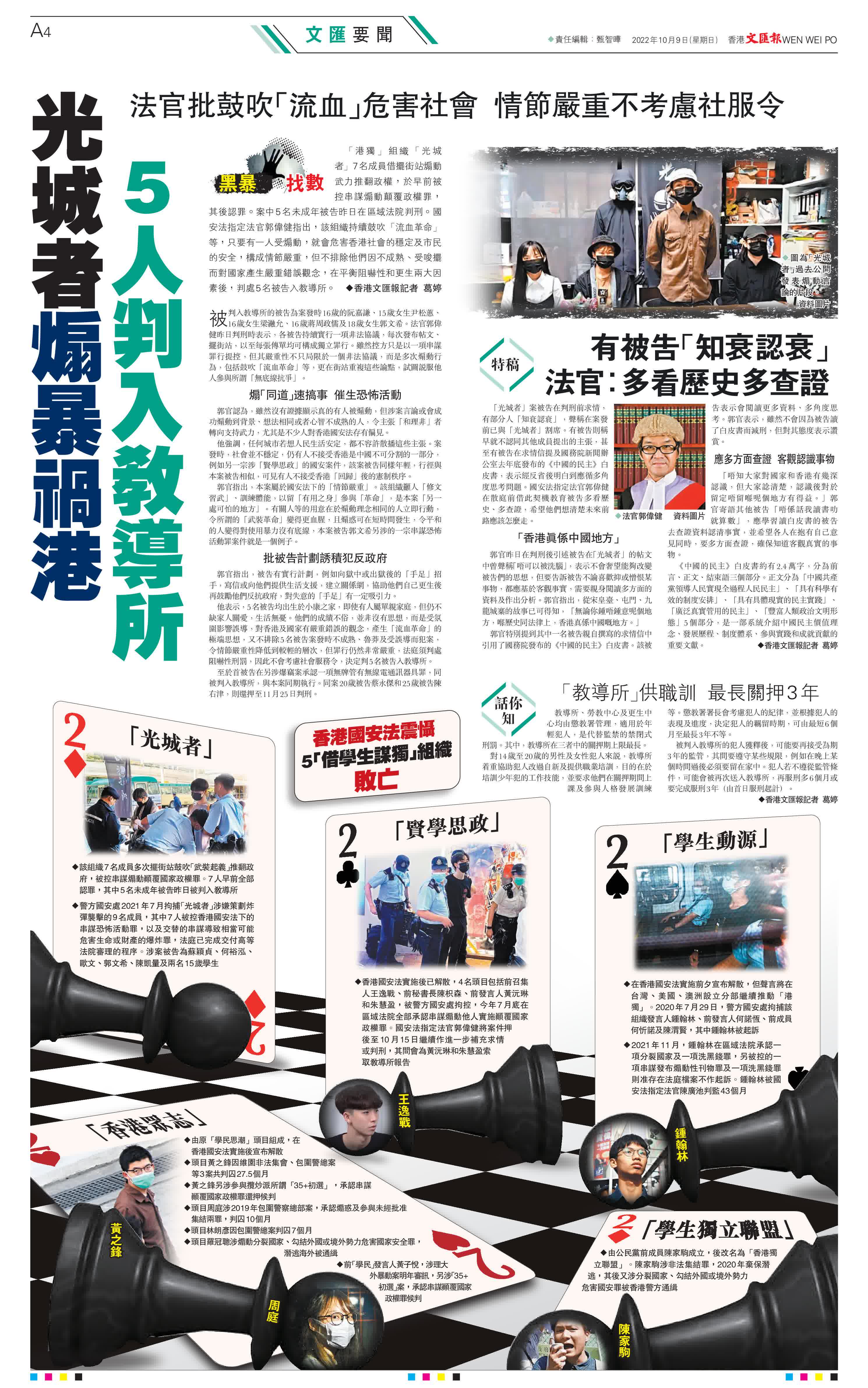 ◆香港國安法實施後已解散,4名頭目包括前召集人王逸戰、前秘書長陳枳森、前發言人黃沅琳和朱慧盈,被警方國安處拘控,今年7月底在區域法院全部承認串謀煽動他人實施顛覆國家政權罪。國安法指定法官郭偉健將案件押後至10月15日繼續作進一步補充求情或判刑,其間會為黃沅琳和朱慧盈索取教導所報告