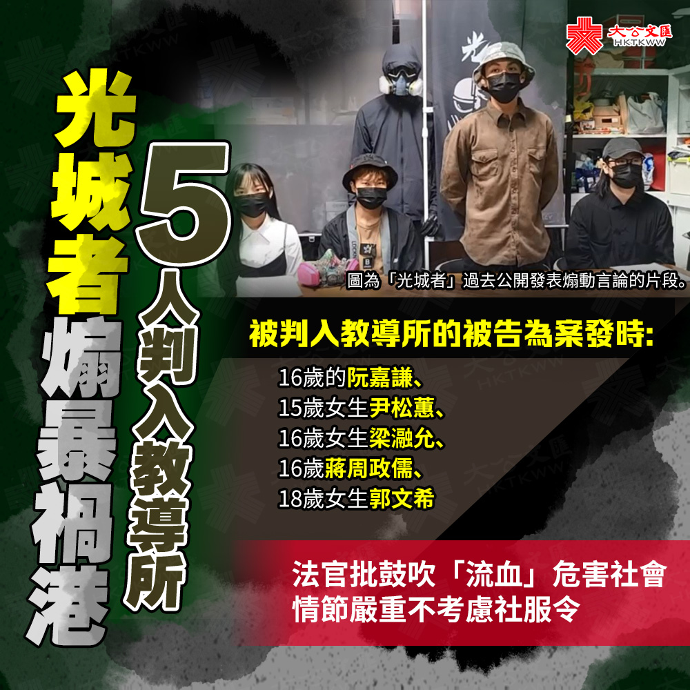 (香港文匯報記者 葛婷)「港獨」組織「光城者」7名成員借擺街站煽動武力推翻政權,於早前被控串謀煽動顛覆政權罪,其後認罪。案中5名未成年被告昨日在區域法院判刑。國安法指定法官郭偉健指出,該組織持續鼓吹「流血革命」等,只要有一人受煽動,就會危害香港社會的穩定及市民的安全,構成情節嚴重,但不排除他們因不成熟、受唆擺而對國家產生嚴重錯誤觀念,在平衡阻嚇性和更生兩大因素後,判處5名被告入教導所。