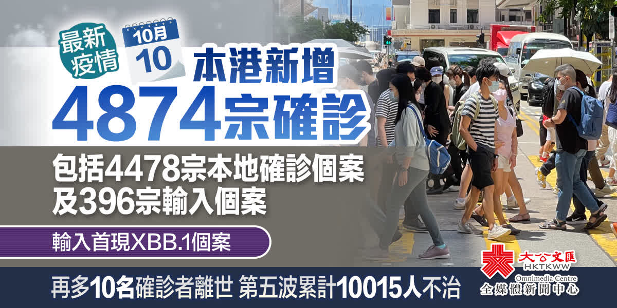 大公文匯全媒體報道,香港第五波疫情持續,衞生署衞生防護中心公布,截至今日(10日)零時,本港過去一日新增4874宗確診個案,當中包括4478宗本地確診個案及396宗輸入個案。本地確診個案中,核酸檢測陽性個案有1172宗,快速抗原測試陽性個案3306宗。