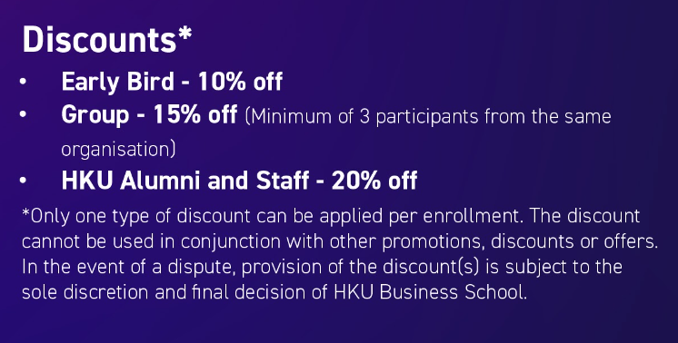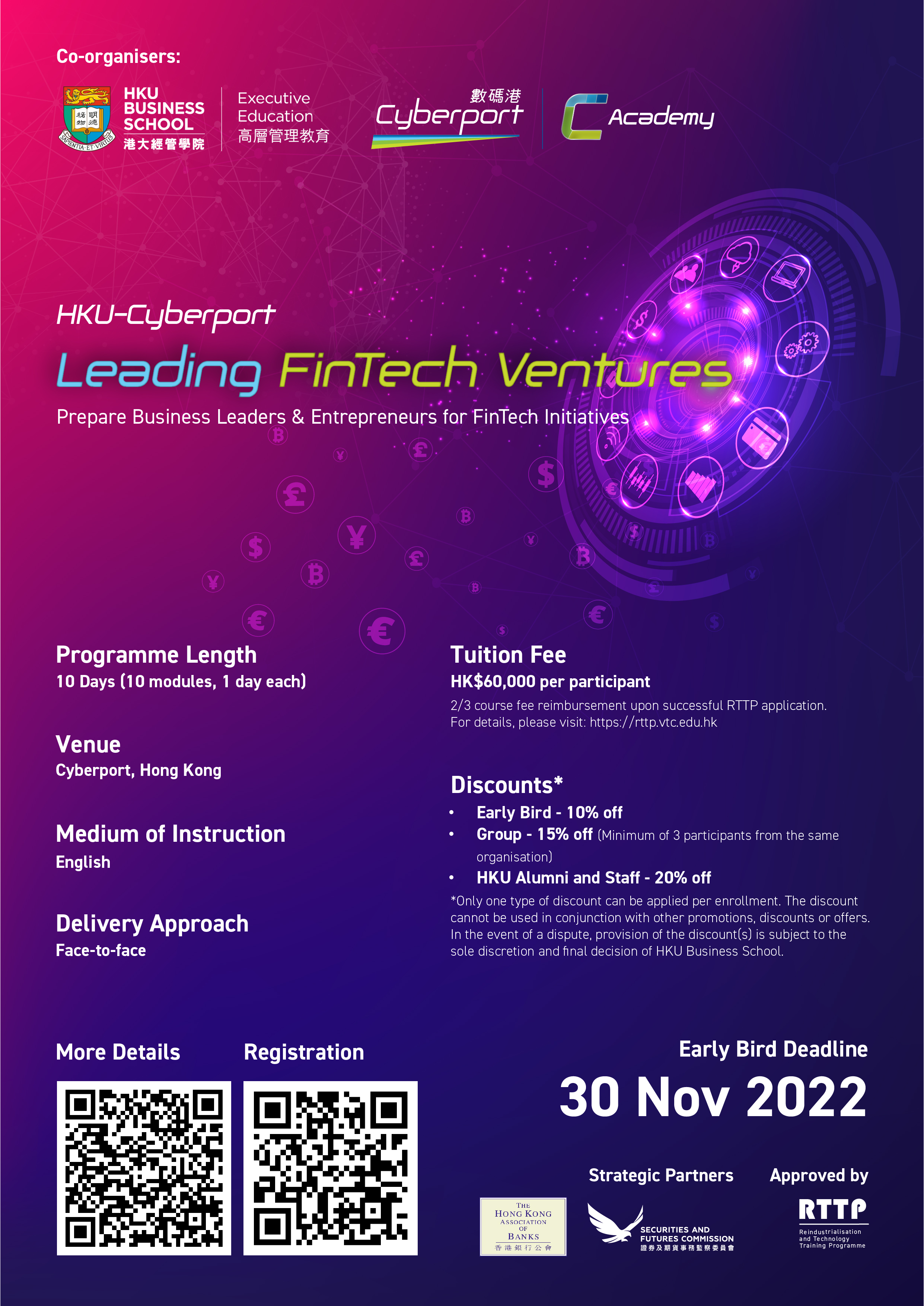 課程將於明年1月開課,以面授形式進行教學,其中10天的課堂將於香港大學數碼港校園舉辦。課程透過多元化活動,如互動討論、案例研究、行業訪問,以及與金融科技從業員交流,將概念框架與知識實踐相互結合。相關課程費用6萬元,不過該課程已納入再工業化及科技培訓計劃的已登記公開課程名單,獲批申請者可獲發高達4萬元的資助,相當於課程費用三分之二。此外,今年11月30日或之前報讀課程可享九折「早鳥優惠」,同機構至少三名員工報讀課程可享八五折「體優惠」,港大校友及教職員可享八折優惠。