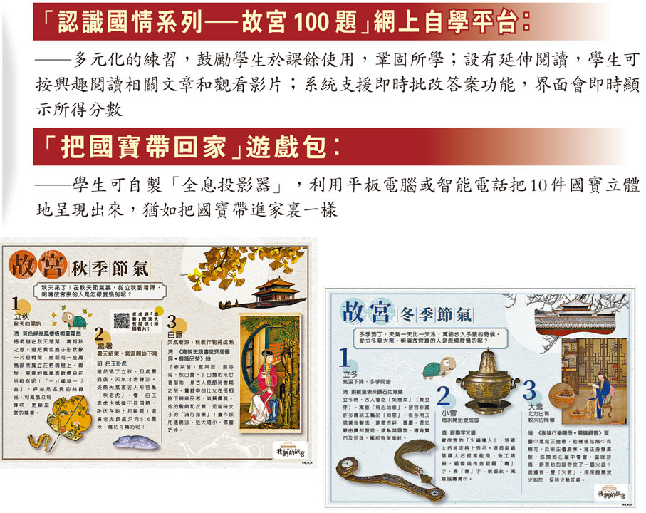 中國文化研究院院長邱逸昨日介紹,為協助學校把握香港故宮館開幕的熱潮,讓學生不只是「打卡」,而是可從認識、理解,到欣賞、熱愛,繼而主動承傳故宮文化,從知、情、意、行承擔起推廣中華文化的使命,研究院把故宮博物院提供的珍貴文物圖像影片及由專家撰寫的文章等,整理和設計成教學資源,藉着述說故宮的文物與人物的故事,讓國寶「活起來」、「走出去」,同時能加強品德情意教育,幫助學生建立正面的價值觀和態度。