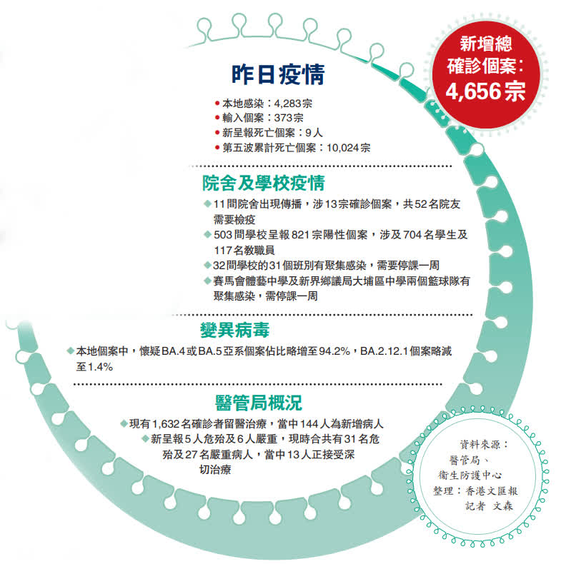 香港昨日新增4,656宗新冠肺炎確診個案,是連續第六天日增確診四千宗以上。港大最新病毒繁殖率1.0263,意味每名確診者感染超過一人,未來確診人數仍可能上升,新增留院病人的危重率昨日略增至約5%。對於香港日前發現一名從新加坡抵港人士帶有新變種病毒BA.2.75.2,此病毒更令新加坡疫情反彈,當地二次感染比率更飆升至15%,有香港防疫專家指出,新加坡解除口罩令,以及放寬入境限制,代價是疫情反彈,但香港仍維持防疫措施,出現大規模二次感染的機會較小。