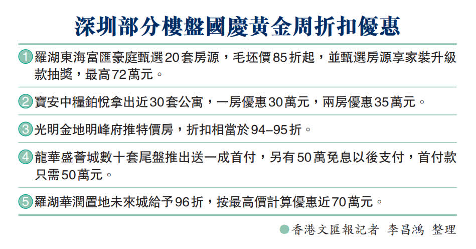 記者在採訪中獲悉,為吸引客戶眼球,許多樓盤在國慶黃金周紛紛推出五花八門折扣。美聯物業有關負責人胡先生表示,位於羅湖的東海富匯豪庭在黃金周甄選20套房源,毛坯價85折起銷售,並甄選房源享家裝升級款抽獎,最高72萬元。