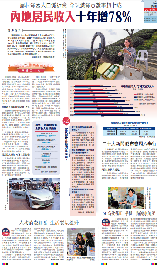 (大公報記者 張帥北京報道)據國家統計局10月11日發布的中共十八大以來經濟社會發展成就系列報告,2021年全國居民人均可支配收入35128元(人民幣,下同),比2012年的16510元增加18618元,扣除價格因素,累計實際增長78.0%,年均實際增長6.6%。在2013-2020年間,全國農村貧困人口累計減少9899萬人,年均減貧1237萬人,對全球減貧貢獻率超過七成。中國居民收入較快增長,收入結構不斷改善,消費水平持續提高,生活質量穩步提升。