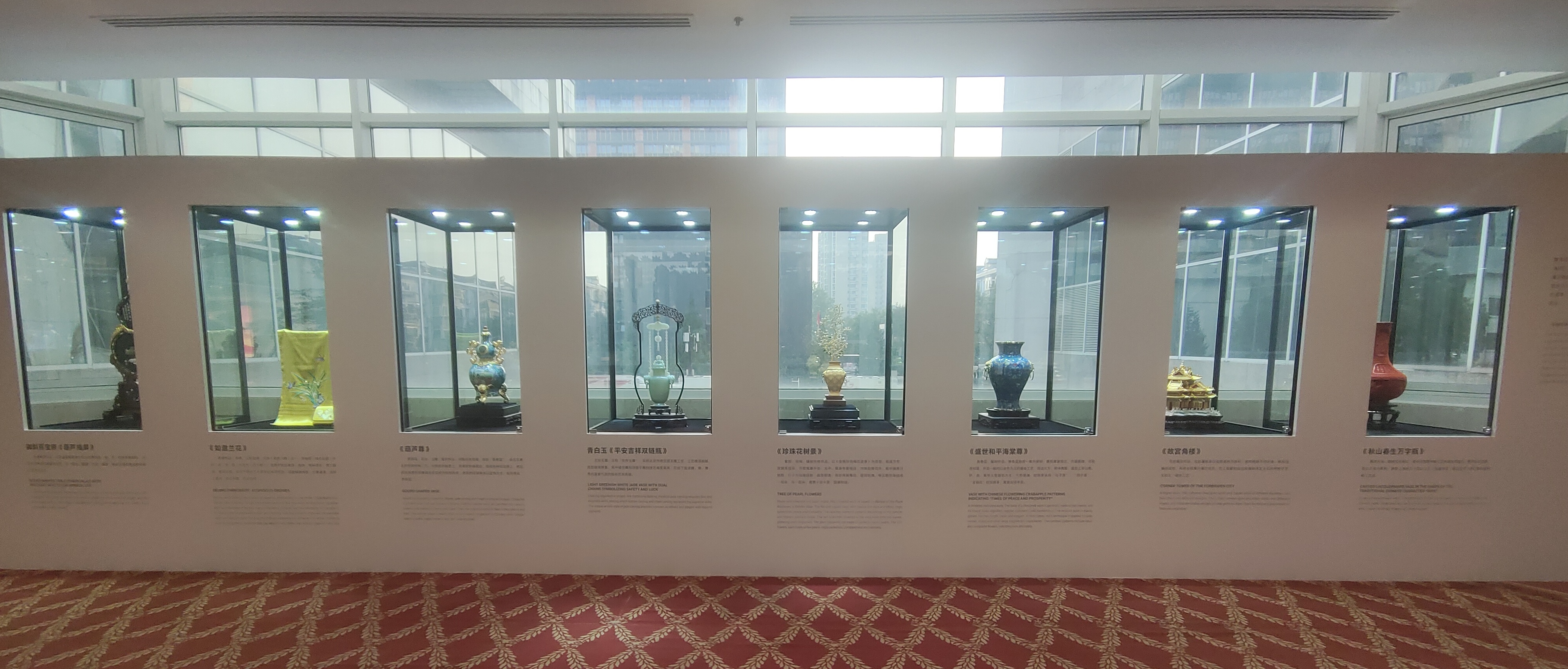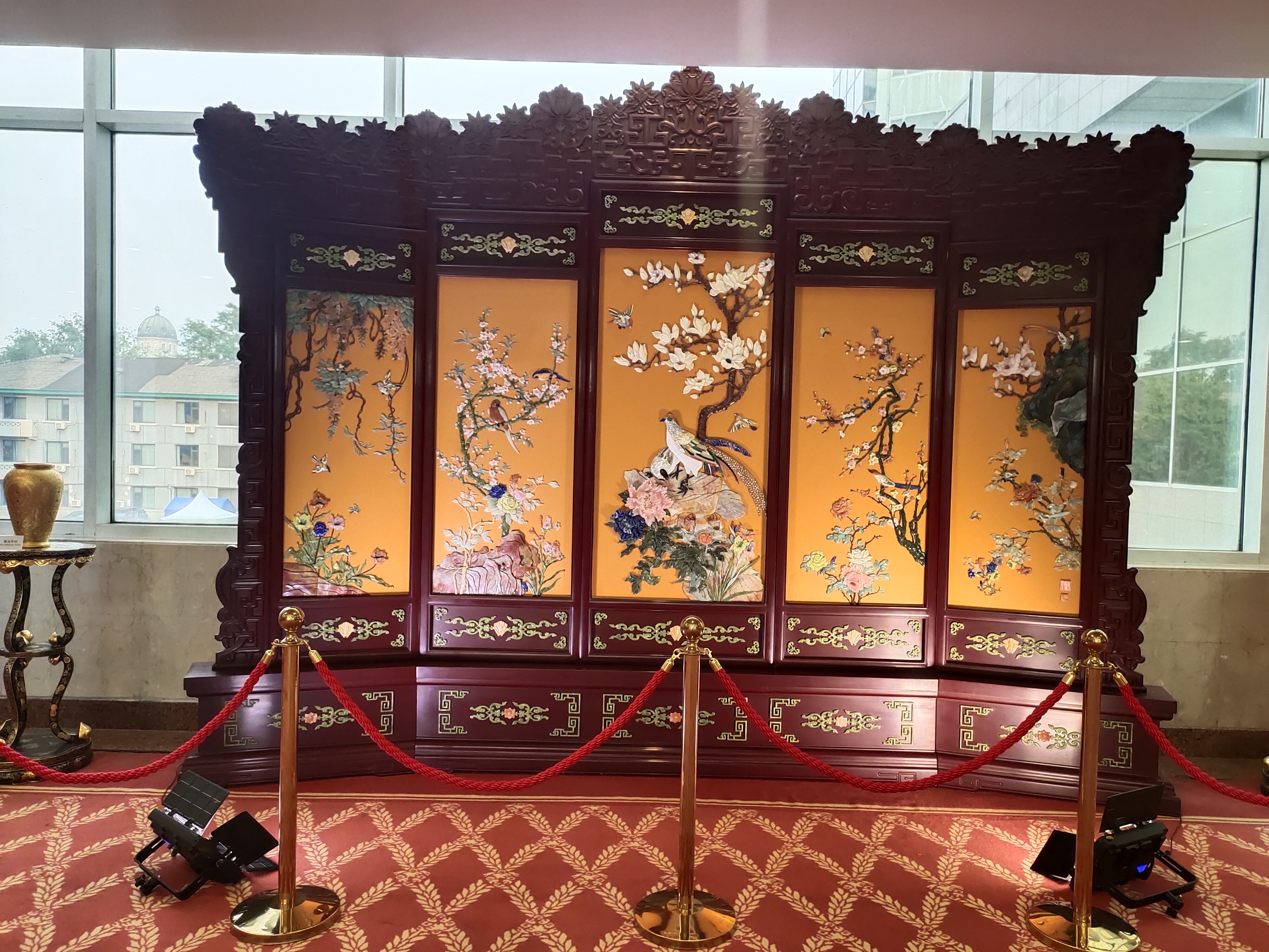 新聞中心記者工作區門口通道兩側專設非遺精品展示區,華美的京劇戲服、《鳥語花香》百寶嵌屏風、燕京八絕、京劇臉譜、剪紙、繩藝等展品盡列其中,吸引不少外國記者駐足拍攝。每個展區前都有中英雙語的介紹,方便中外記者了解中國非遺文化。