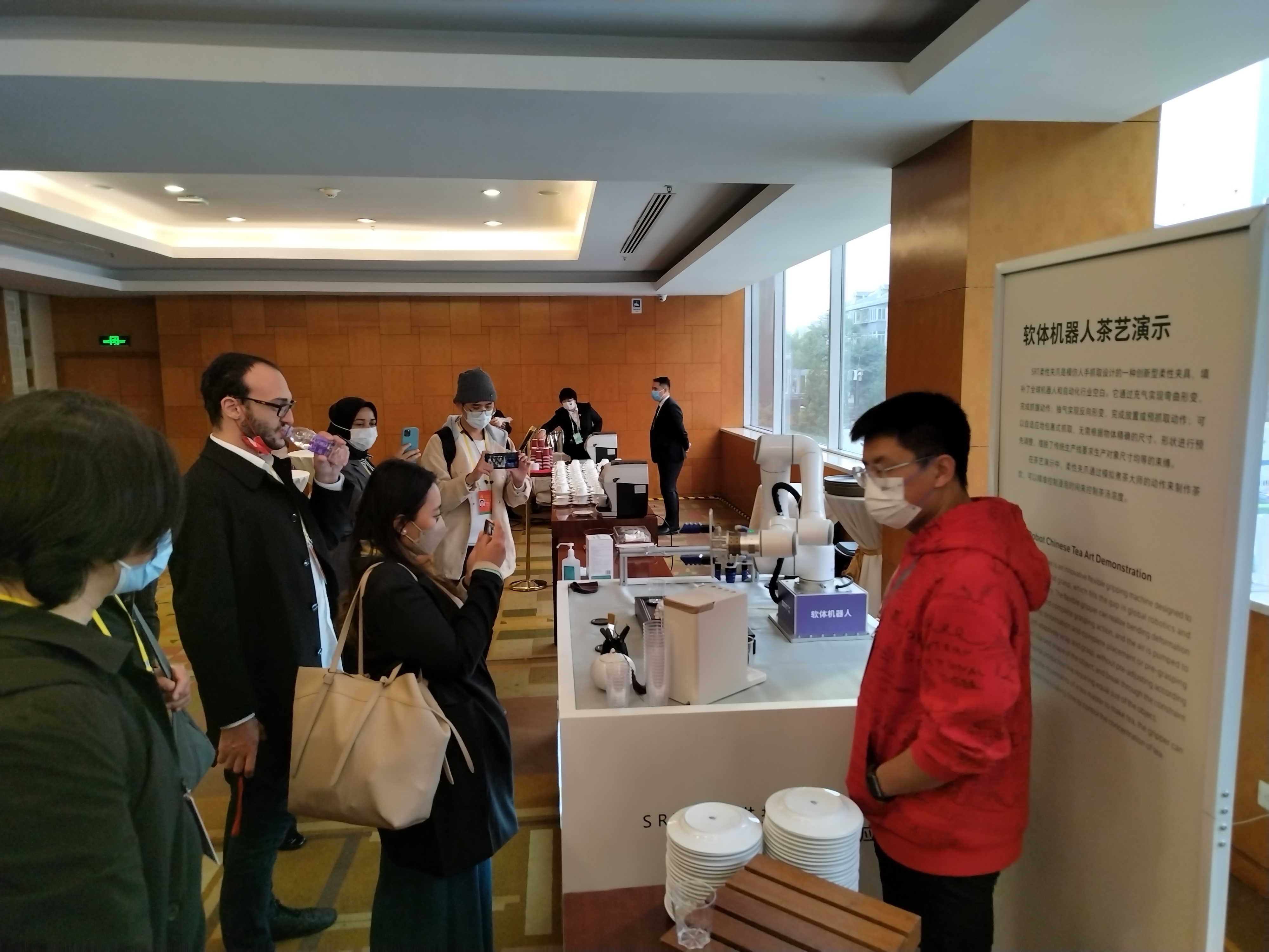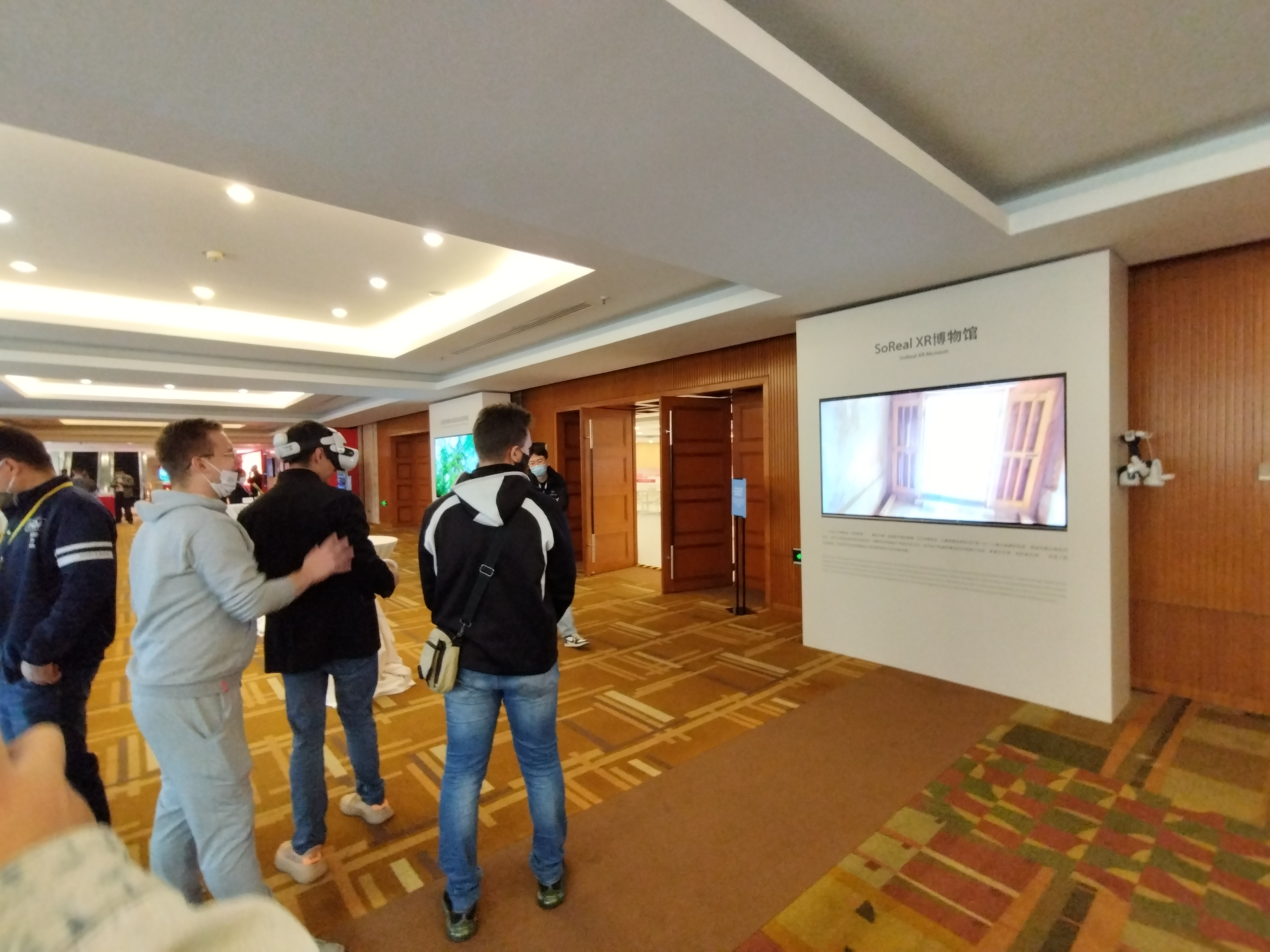 在茶藝機械人展示台,中外記者不僅可以觀看機械人嫻熟的茶藝表演,還能品嘗到中國茶。一旁的SoReal XR博物館展區,外國記者競相佩戴設備,體驗「夢回敦煌」、「秦兵馬俑」,並與文物互動。據悉,該技術通過運用數字虛擬建模、5G+XR等,以數字與現實相結合形式打造一比一三維立體虛擬環境,使遊覽者可身臨其境欣賞文物風采,領略中華數千年歷史文化。